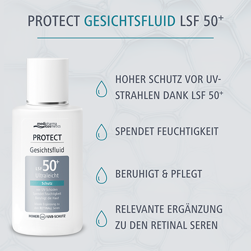 Am nächsten Morgen sollte unbedingt das PROTECT Gesichtsfluid LSF 50+ aufgetragen werden, um die Haut vor UV-bedingten Schäden zu schützen.