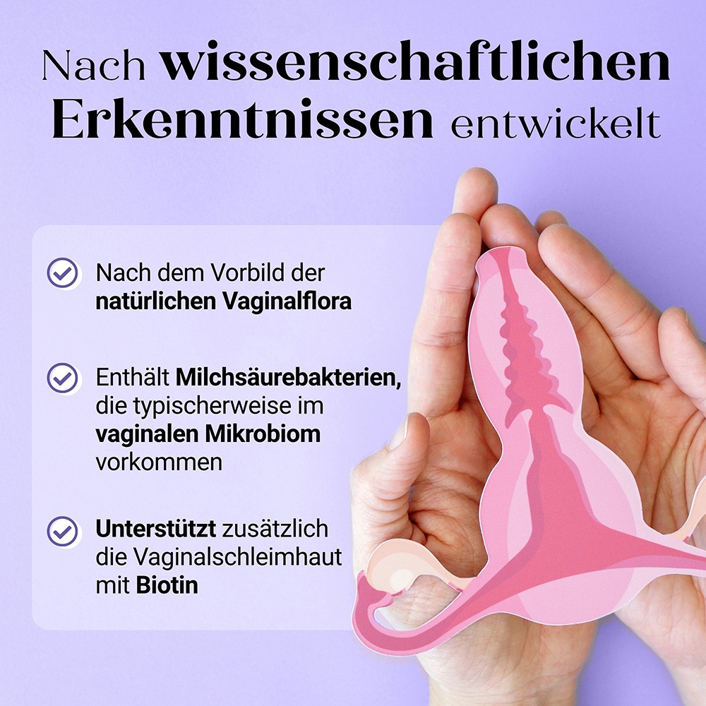 - Mit 8 gezielt ausgewählten Milchsäurebakterien-Stämmen, die natürlicherweise in der Vaginalflora vorkommen