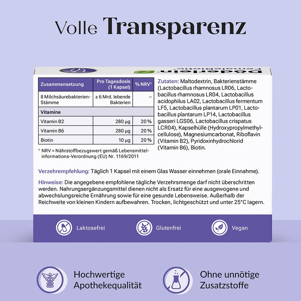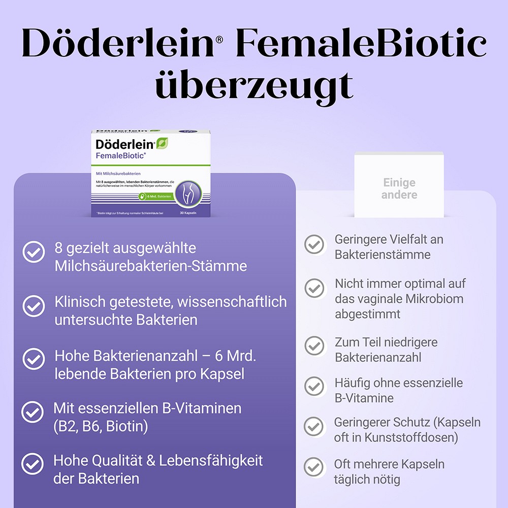 Milchsäurebakterien, auch Döderlein-Bakterien genannt, sind Bestandteil eines gesundes vaginalen Mikrobioms. Ein Mangel an Milchsäurebakterien kann zu einer gestörten Balance und einem erhöhten Risiko für Infektionen wie Scheidenpilz, bakterielle Vaginose und Harnwegsinfektionen führen.Döderlein FemaleBiotic enthält 8 speziell ausgewählte Milchsäurebakterien-Stämmen, die natürlicherweise in der Vaginalflora vorkommen. Die wertvollen Vitamine B2, B6 und Biotin unterstützen nicht nur die Erhaltung normaler Schleimhäute1, sondern tragen auch zur Förderung des normalen Energiestoffwechsels2, der Reduzierung von Müdigkeit und Ermüdung3 sowie zur Unterstützung einer gesunden psychischen Funktion4 bei: