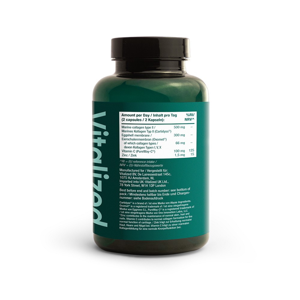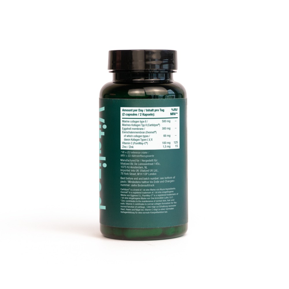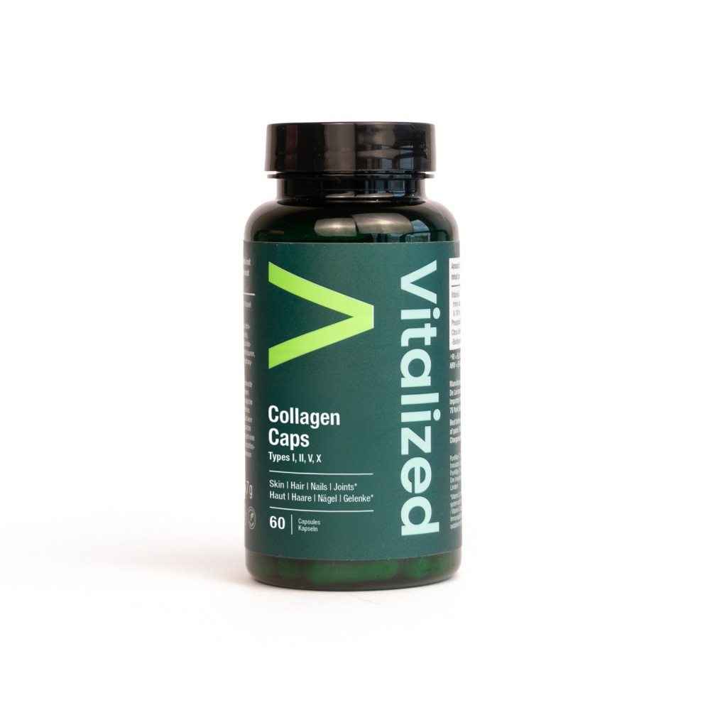Unterstützen Sie Ihre Haut, Haare, Nägel und Gelenke mit Vitalized Collagen Caps – der nachhaltigen, hochwertigen Kombination aus Meeres- und Eierschalenkollagen. Diese innovative Formel vereint die wichtigsten Kollagen-Typen (I, II, V und X) mit wertvollem Vitamin C und Zink, um Ihre natürliche Schönheit von innen heraus zu fördern und die Mobilität zu erhalten.