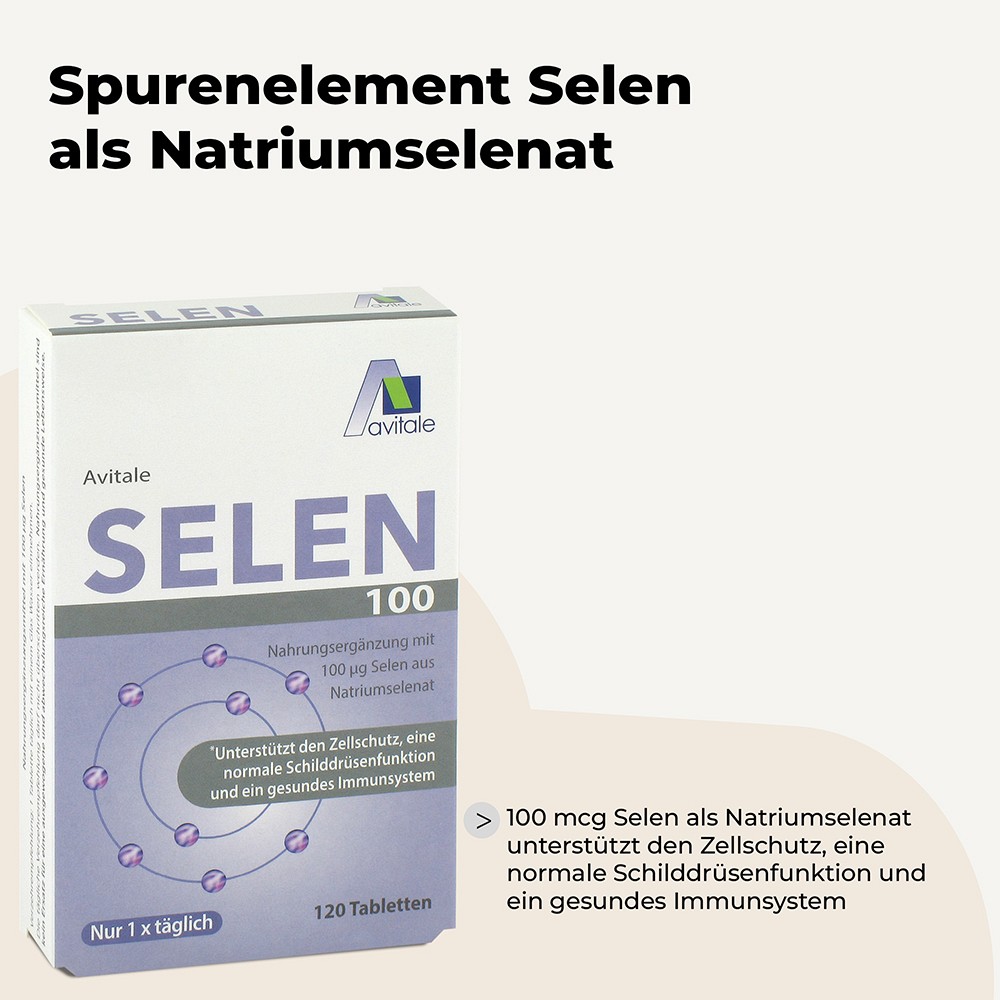Avitale Selen Tabletten liefern mit 100 μg Selen aus Natriumselenat eine gute Versorgung wichtiger Körperfunktionen mit diesem essentiellen Spurenelement.