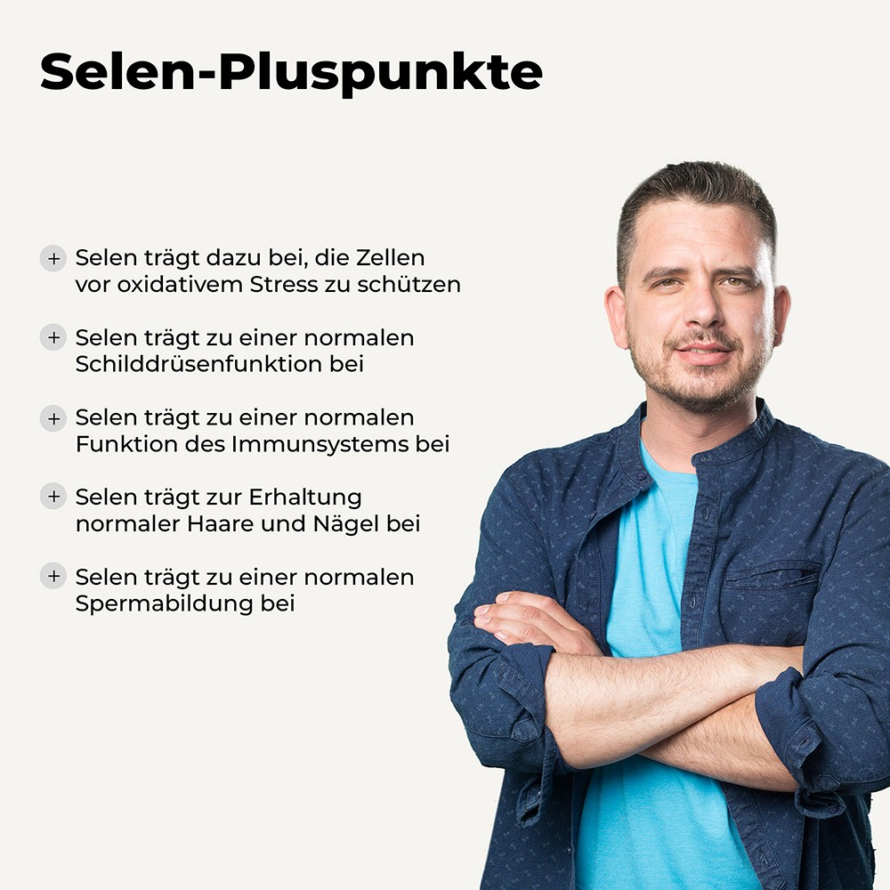 Selen ist ein lebenswichtiges, essentielles Spurenelement und an vielen Stoffwechselprozessen im menschlichen Organismus beteiligt.Es wirkt antioxidativ und schützt die Zellen vor oxidativem Stress und freien Radikalen. Weiterhin unterstützt es eine gesunde Funktion der Schilddrüse sowie die normale Funktion des Immunsystems. Selen ist hilfreich zur Erhaltung normaler Haare und Nägel. Bei Männern trägt Selen zu einer normalen Spermabildung bei.