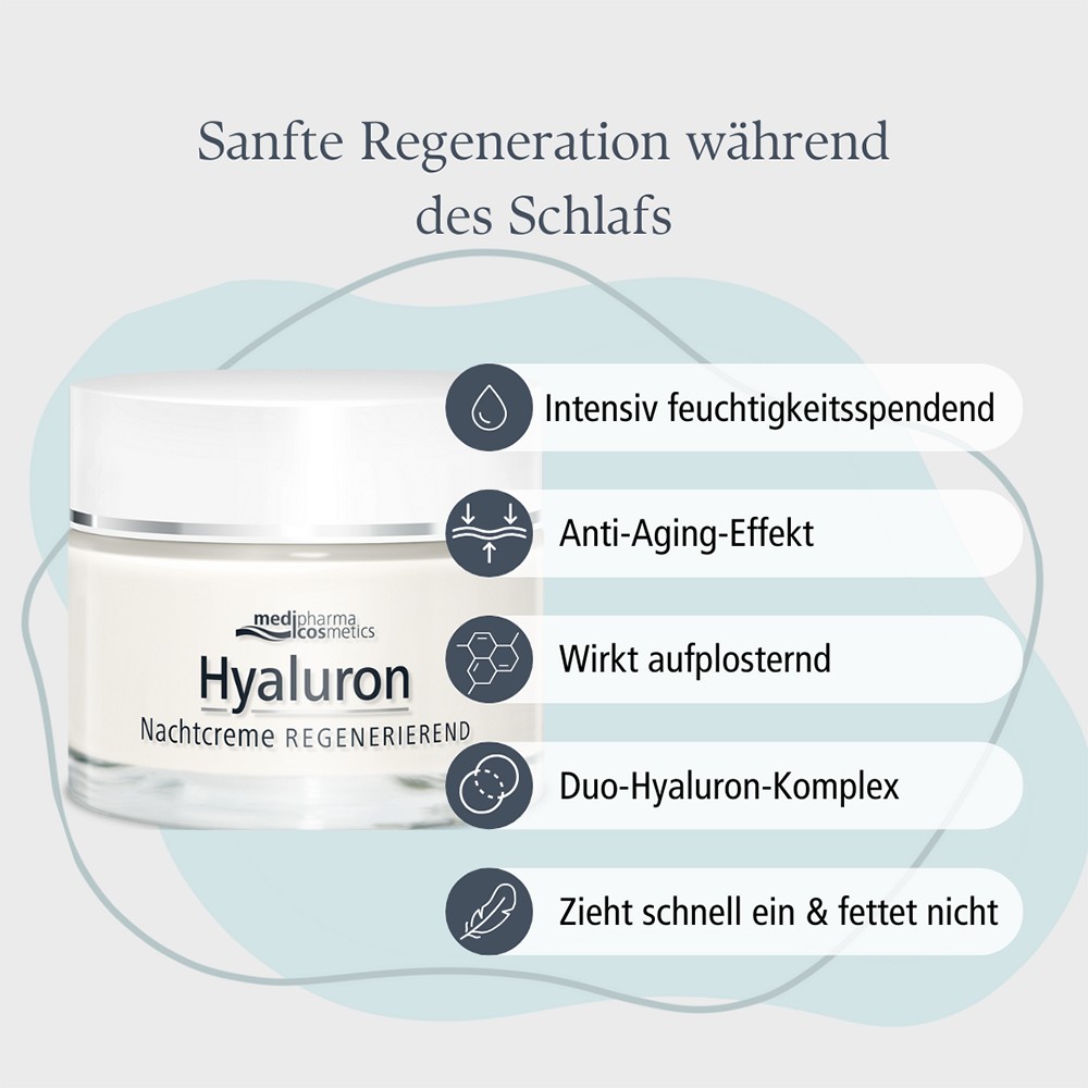 Medipharma cosmetics Hyaluron Nachtcreme: Regenerierende Pflege für normale bis trockene Haut, die in der Nacht Fältchen mildert und die Haut natürlich aufpolstert.