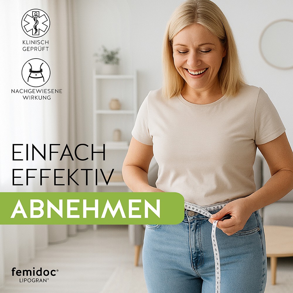Zusammen mit einer kalorienreduzierten Diät und angemessenen körperlichen Aktivitäten kann femidoc LIPOGRAN daher als unterstützendes Mittel zur Gewichtskontrolle und Reduzierung des Gesamtkörperfettes eingesetzt werden. femidoc LIPOGRAN unterstützt eine Reduktionsdiät positiv.