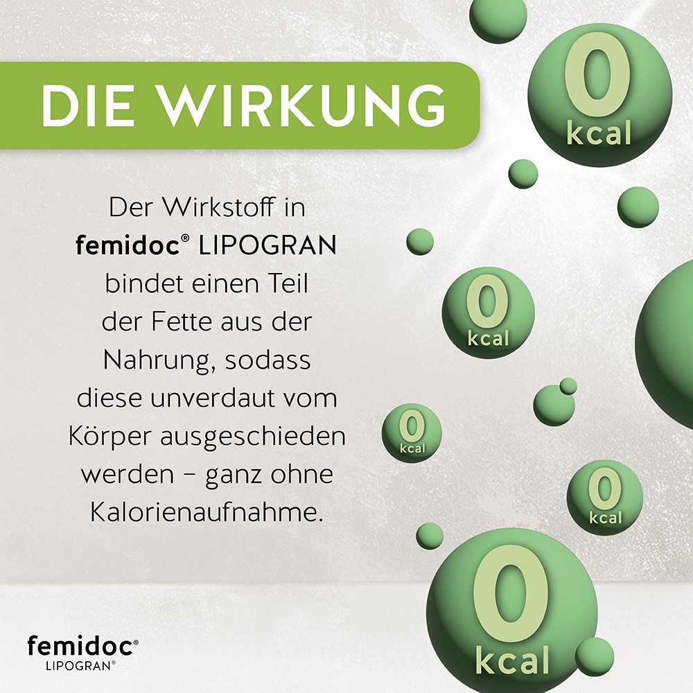 Fettbinder zur Unterstützung einer Reduktionsdiät bei Übergewicht bzw. zur Gewichtskontrolle im Rahmen einer fettbewussten Ernährungfemidoc LIPOGRAN enthält Feigenkaktuspulver, einen aus Pflanzen gewonnenen Faserkomplex. Dieser Faserkomplex bindet im Magen Fette aus der Nahrung zu einem stabilen Fett-Faser-Komplex und entzieht sie somit dem Verdauungsvorgang. Der Fett-Faser-Komplex wird dann auf natürlichem Wege ausgeschieden. Ferner kann durch die Quellwirkung ein leichtes Sättigungsgefühl hervorgerufen werden.