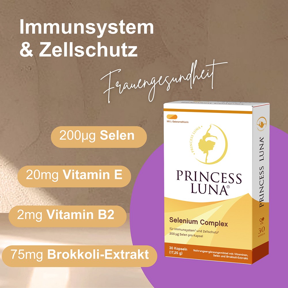 Princess Luna Selenium Complex wurde entwickelt, um die Abwehrkräfte und den antioxidativen Zellschutz optimal zu unterstützen – mit einer hochwertigen Kombination aus Selen, Vitamin E, Vitamin B2 und Brokkoli-Extrakt.Selen – Unterstützung für das Immunsystem und antioxidativer Zellschutz