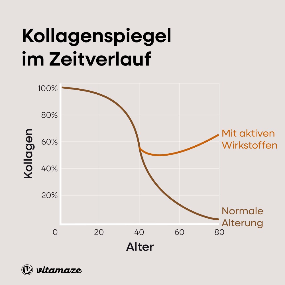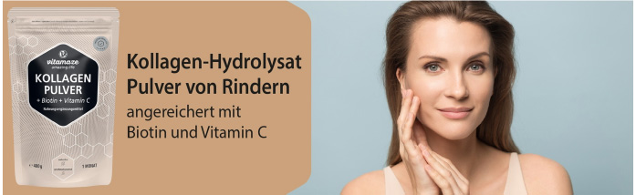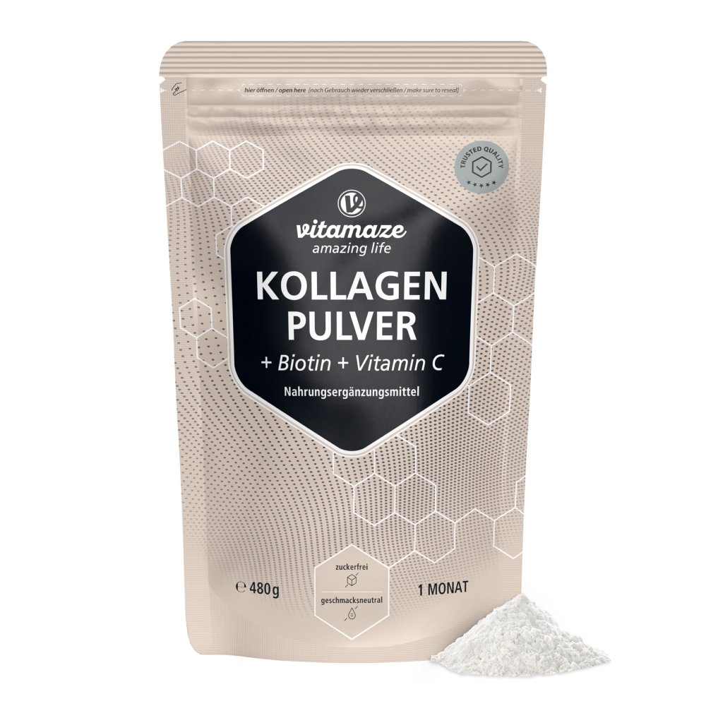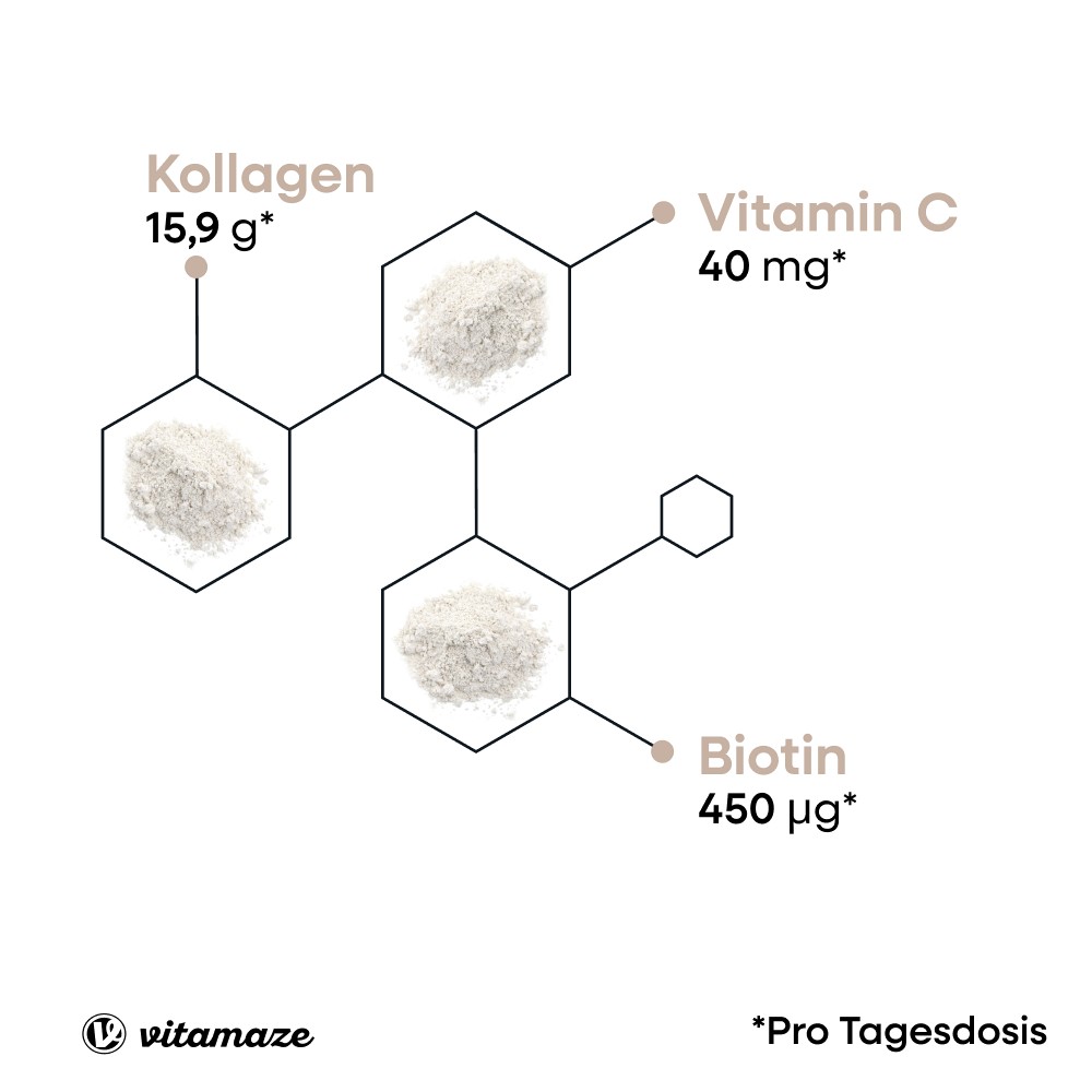 Hochwertige Pulvermischung mit einer sorgfältig abgestimmten Kombination aus Kollagen-Hydrolysat (kleine Peptide) 15,9 mg, Biotin 450 μg und Vitamin C 40 mg. Das Pulver ist geschmacksneutral und zuckerfrei – und in gewohnter Qualität von Vitamaze.Kollagen ist ein Strukturprotein, das im menschlichen Körper eine wichtige Rolle spielt und in verschiedenen Geweben wie Haut, Knochen, Knorpel, Sehnen und Bändern vorkommt. Biotin, auch als Vitamin B7 bekannt, trägt zur Erhaltung gesunder Haut und Haare bei.1 Vitamin C unterstützt nicht nur die körpereigene Kollagenbildung, es schützt auch die Zellen vor oxidativem Stress.2