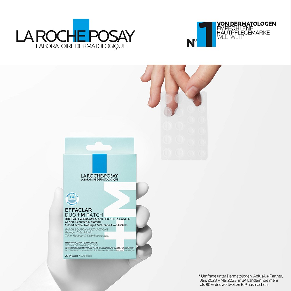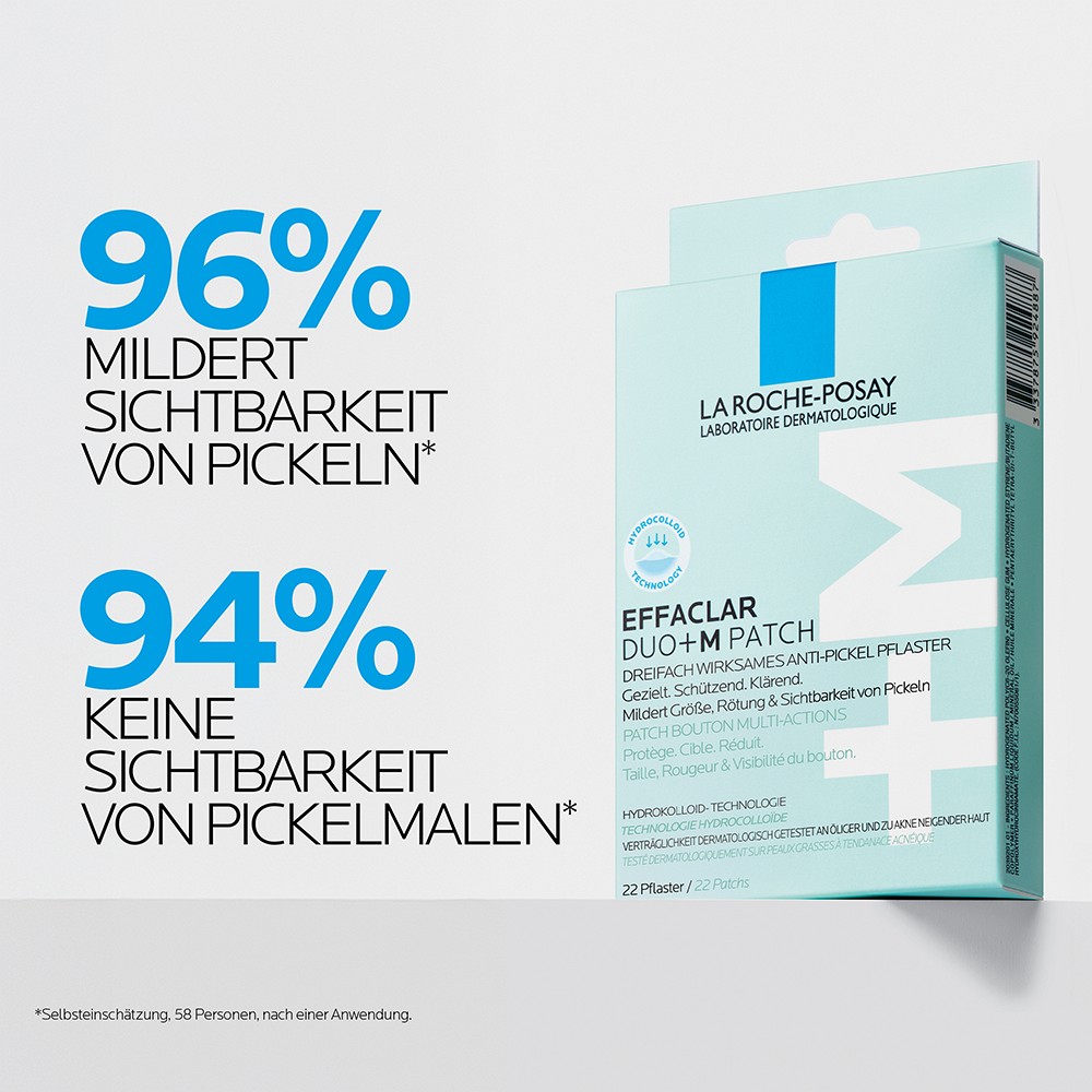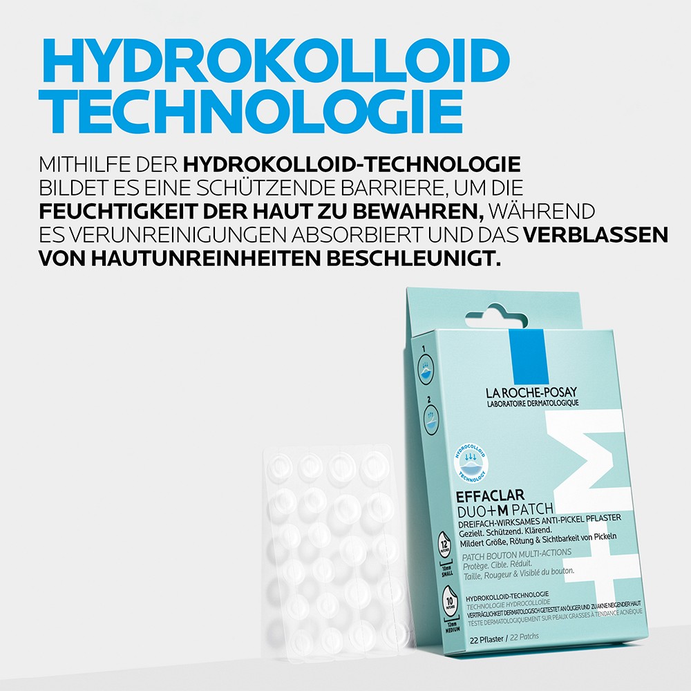 dreifach wirksames Anti-Pickel Pflaster gegen die Sichtbarkeit von Pickeln und PickelmalenDas EFFACLAR Duo+M Patch von La Roche Posay ist ein zuverlässiger Begleiter bei Pickeln! Mit seiner dreifach wirksamen Formel wirkt es gezielt, schützt die Haut und klärt sichtbar. Die innovative Hydrokolloid-Technologie bildet dabei eine schützende Barriere, bewahrt die Feuchtigkeit der Haut und absorbiert Verunreinigungen für ein schnelleres Verblassen von Hautunreinheiten.