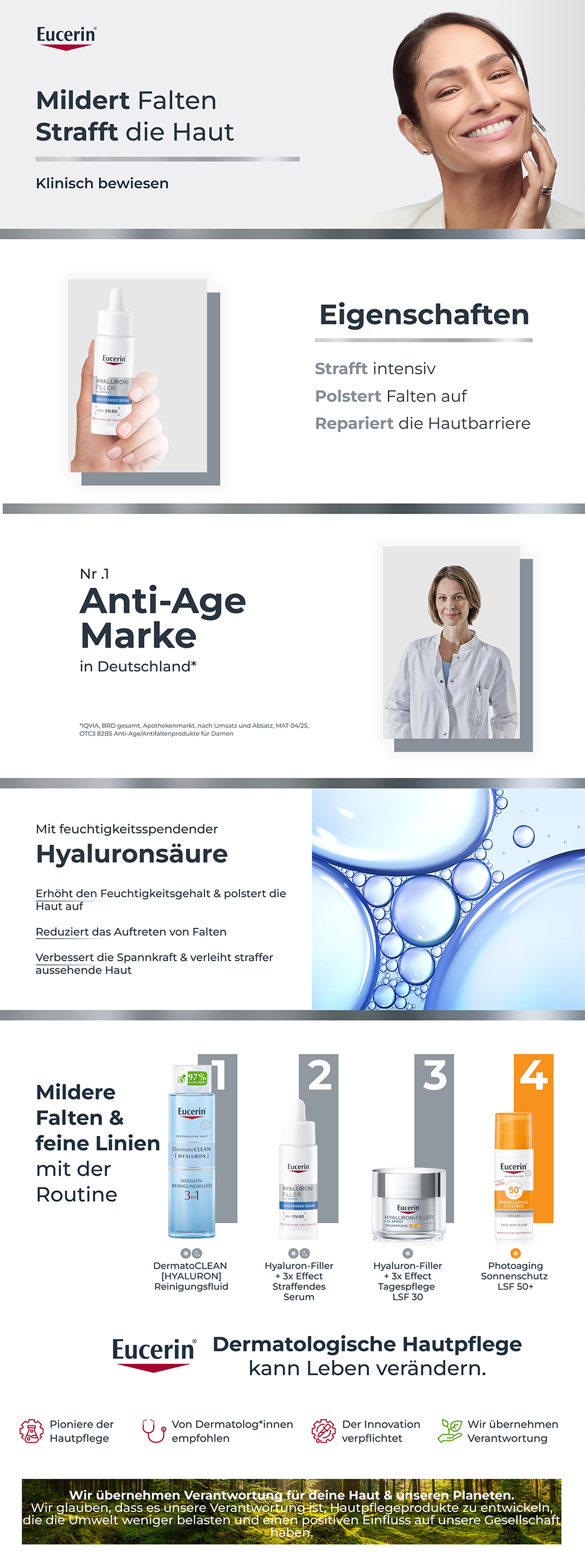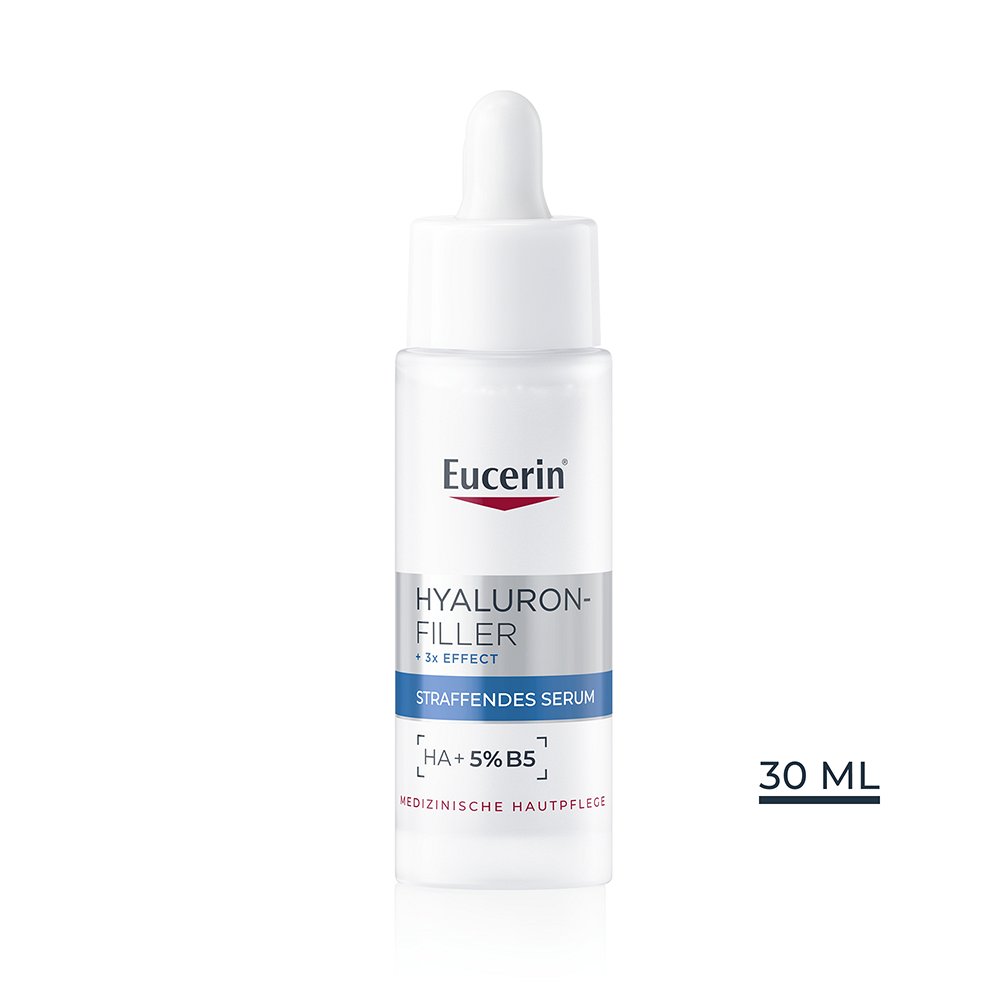 Das Eucerin Hyaluron-Filler + 3x Effect Straffendes Serum ist ein hochwirksames Anti-Aging Gel, das Falten sichtbar glättet und der Haut neue Spannkraft verleiht. In bereits 4 Wochen* sieht die Haut sichtbar straffer und jünger aus. Die Kombination aus hochkonzentrierter Hyaluronsäure, Glycerin und 5% Provitamin B5 versorgt die Haut intensiv mit Feuchtigkeit und fördert die Hautregeneration – für eine starke, widerstandsfähige Barrierefunktion der Haut.