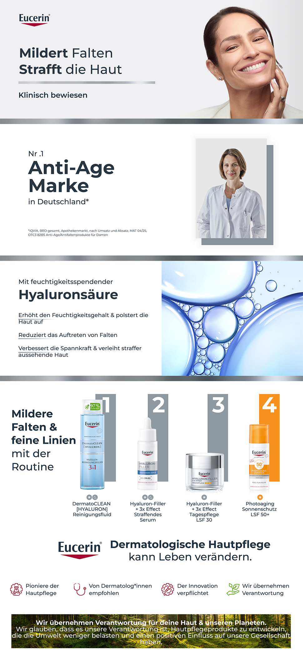 Über Nacht verliert die Haut Feuchtigkeit, was zu Trockenheit, feinen Falten und einem fahlen Teint führt. Das Eucerin Hyaluron-Filler + 3x Effect Hydra Nacht Gel ist eine ultraleichte Anti-Aging Nachtcreme, die 72 Stunden lang Feuchtigkeit spendet und die Haut regeneriert. Dank der Kombination aus Hyaluronsäure, Glycerin und Provitamin B5 wirkt die innovative Gesichtspflege glättend, beruhigend und aufpolsternd – für eine frische, erholte Haut am nächsten Morgen.Das Serum mit ultraleichter Textur zieht schnell in die Haut ein und eignet sich für alle Hauttypen. Klinische und dermatologische Studien beweisen, dass die Hautpflege eine sehr gute Hautverträglichkeit und Wirksamkeit aufweist.