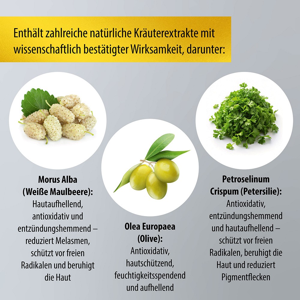 - Hilft, die Symptome von Melasma (Chloasma faciei, Pigmentflecken im Gesicht) zu verringern