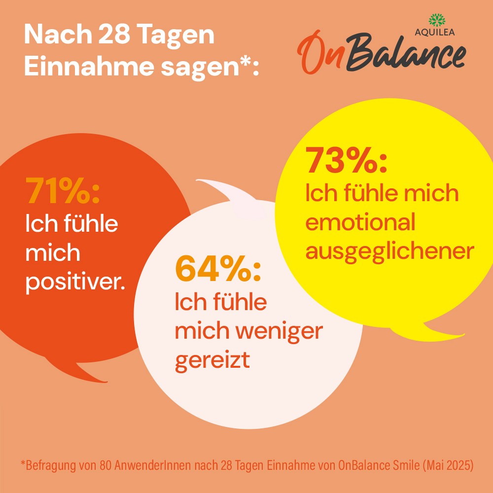 AQUILEA OnBalance Smile kann dich dank seiner einzigartigen Inhaltsstoffe dabei unterstützen, deine emotionale Stabilität zu stärken und wieder „mehr Leichtigkeit“ zu spüren. Die wertvollen Pflanzenextrakte können dir helfen, innere Balance und gute Stimmung zu unterstützen– als einfache, natürliche Routine im Alltag.