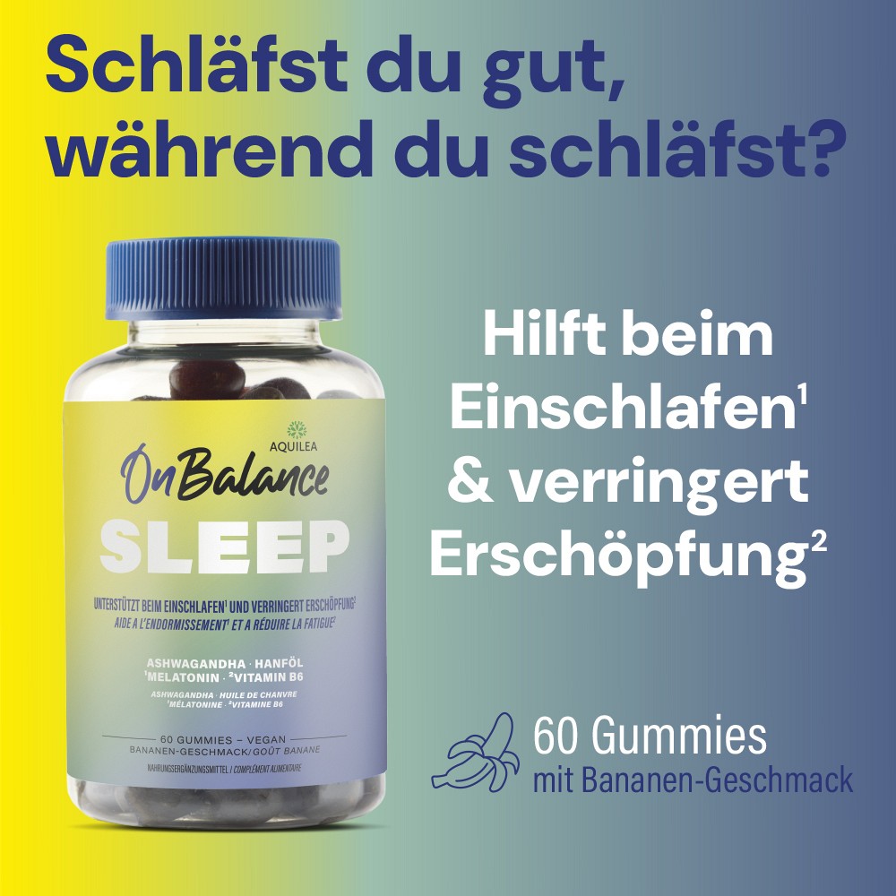 AQUILEA OnBalance Sleep bietet hier eine einfache Routine: Mit Melatonin und natürlichen Inhaltsstoffen unterstützt es dich dabei, schneller einzuschlafen, erholter aufzuwachen und gleichzeitig mentale Ruhe zu fördern.