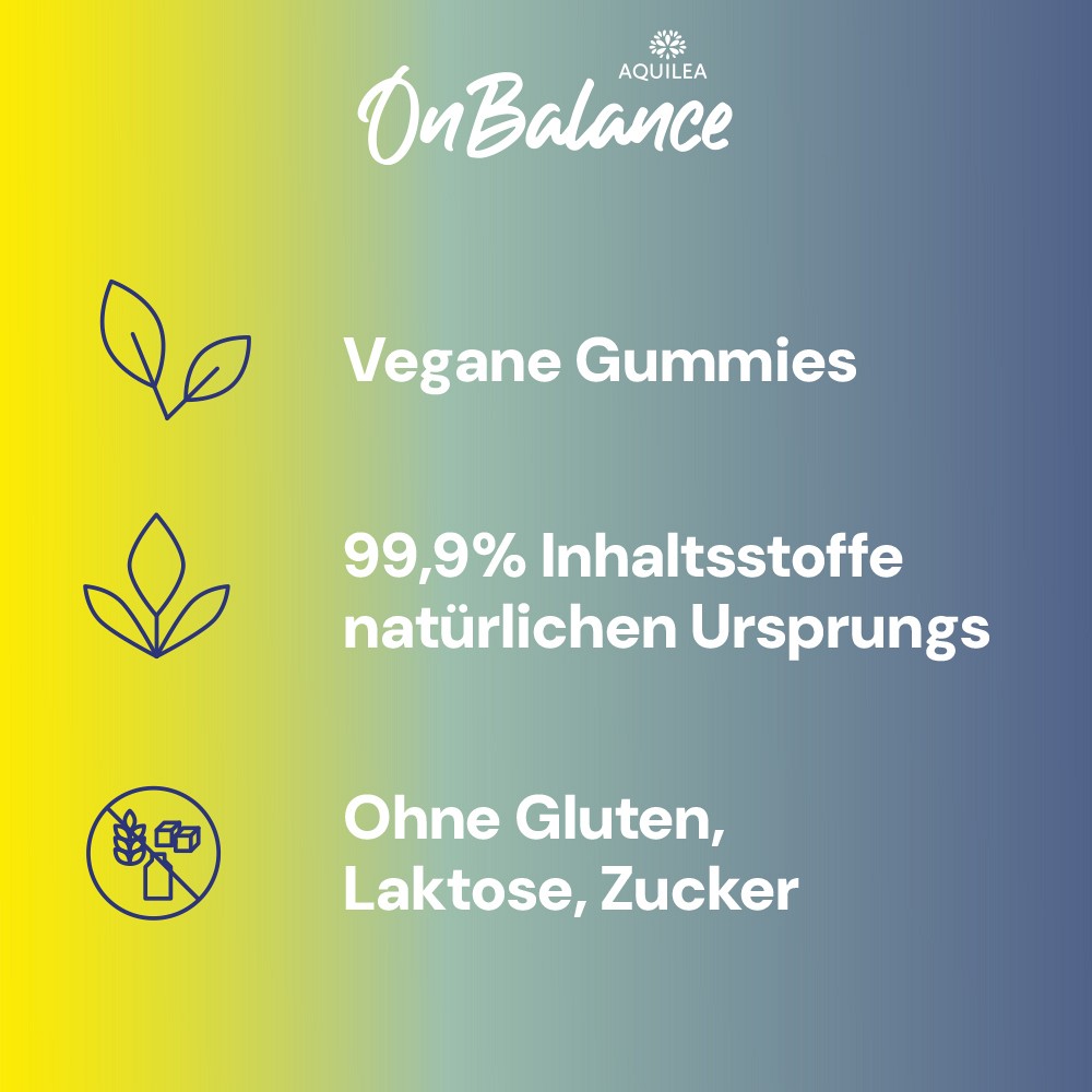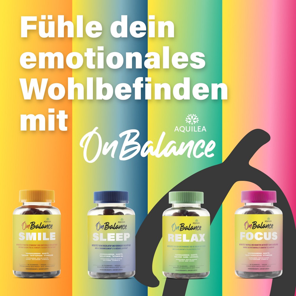 Aquilea steht international seit über 50 Jahren für Qualität und Forschung. Die OnBalance Gummies enthalten innovative Inhaltsstoffe – wissenschaftlich fundiert und clever kombiniert.Aquilea OnBalance will dazu beitragen, psychische Gesundheit neu zu denken – mit einfachen, alltagstauglichen Lösungen für mehr innere Balance.