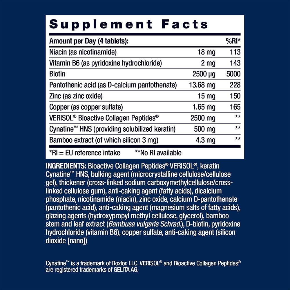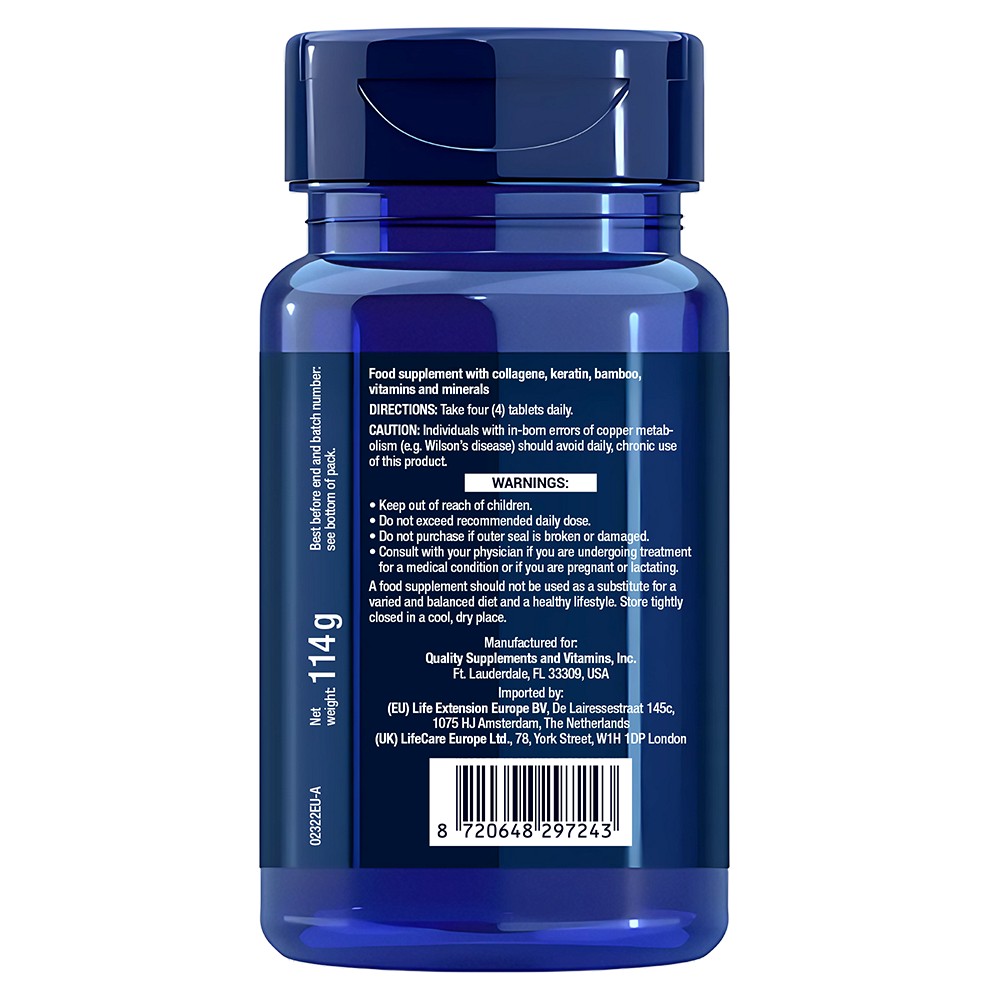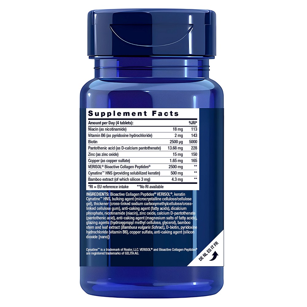 Die Life Extension Tabletten aus essenziellen B-Vitaminen, löslichem Keratin, Sizilium, Kupfer, Zink und VERISOL bioaktiven Kollagenpeptiden tragen zur Anregung der Kollagen- und Elastinbildung und damit zur gesunden Elastizität der Haut bei.