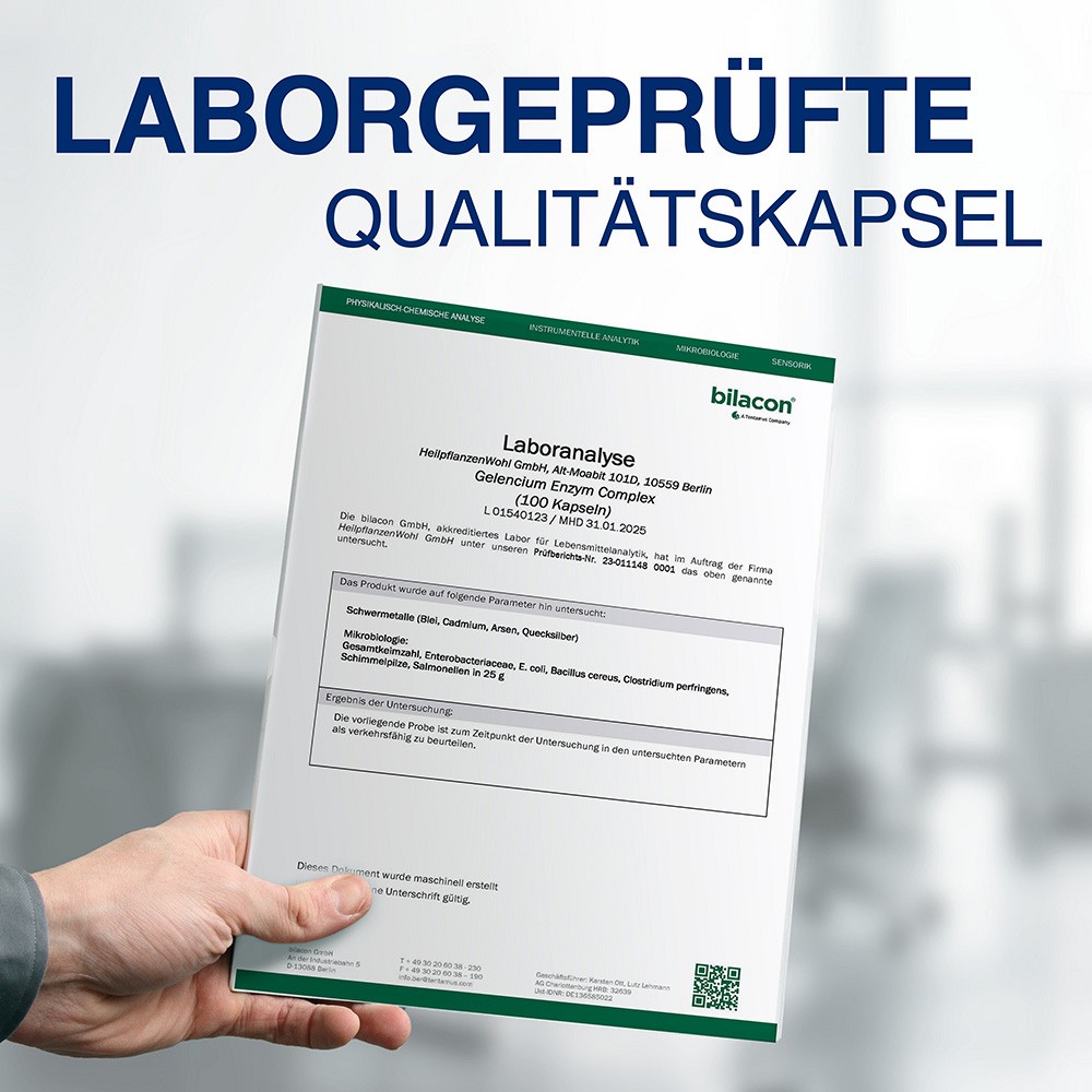 GELENCIUM Enzym Complex wird unter Einhaltung höchster Qualitätsstandards in Deutschland hergestellt. Durch eine besonders hohe Qualität der verwendeten Rohstoffe, HACCP-zertifizierte Lieferanten sowie die regelmäßige Testung mikrobiologischer Parameter (z.B. Schwermetalle, Pestizide) können wir zu jedem Zeitpunkt eine einwandfreie Qualität garantieren.