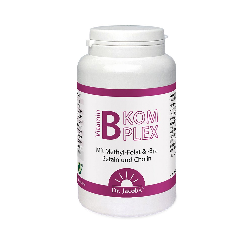 Dr. Jacob’s Vitamin-B-Komplex enthält alle essenziellen B-Vitamine in einer einzigen Kapsel: Vitamin B1, B2, B6, B12, Niacin (B3), Pantothensäure (B5), Biotin (B7), und Folsäure (B9). Die B-Vitamine arbeiten synergetisch zusammen – nur in ausreichender Menge können sie lebenswichtige Prozesse optimal unterstützen.Einige B-Vitamine müssen vom Körper erst in ihre aktive Form umgewandelt werden. Folsäure und Vitamin B12 werden hierfür beispielsweise methyliert. Funktioniert der Methylierungsprozess nicht optimal, kann auch eine ausreichende Folsäure- und B12-Zufuhr nicht den gewünschten Effekt erzielen.