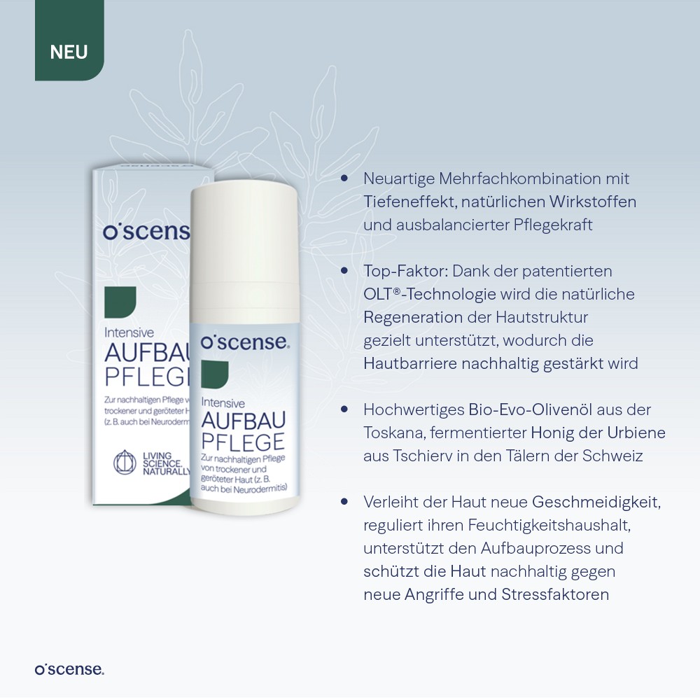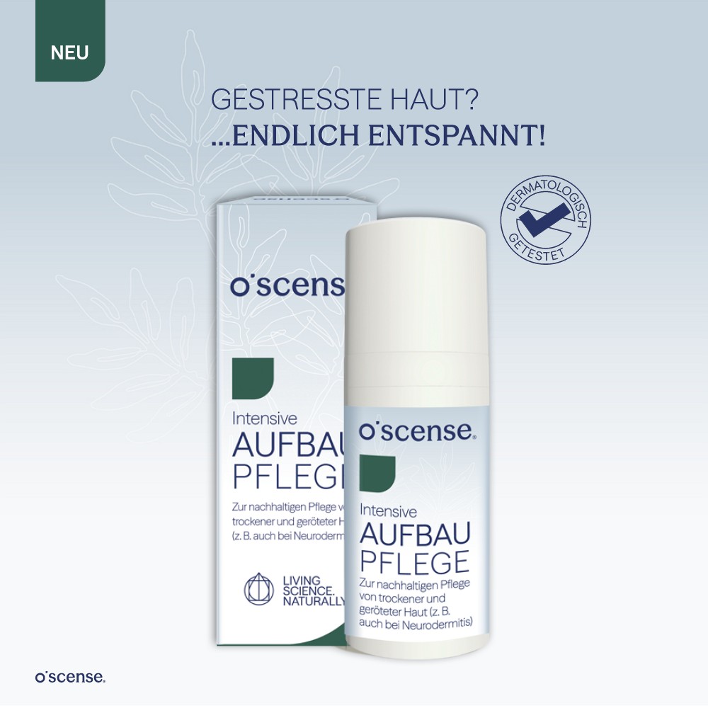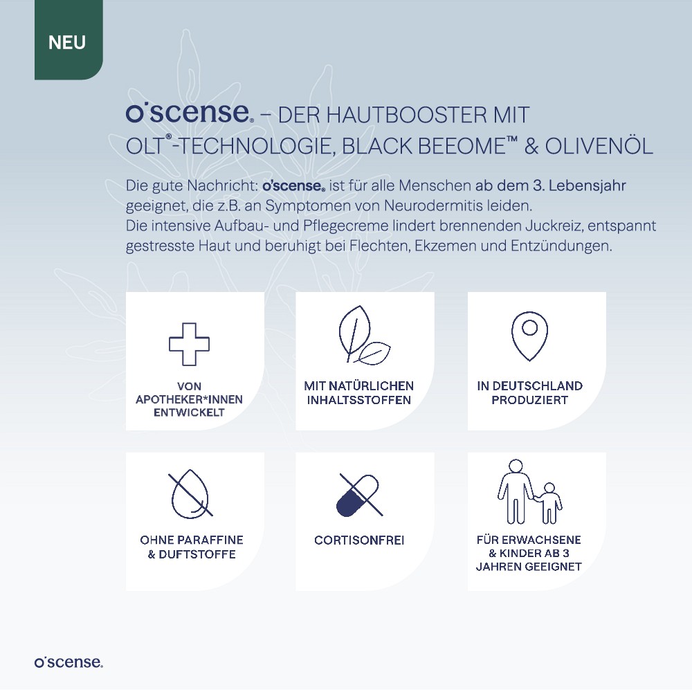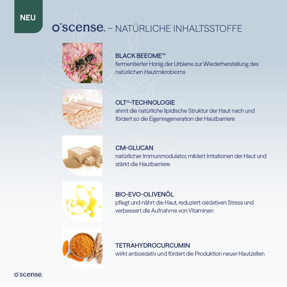 Die intensive Aufbaucreme ist für jeden ab dem 3. Lebensjahr geeignet, der an sehr trockener, neurodermitischer oder zu Ekzemen neigender Haut leidet. o’scense lindert zuverlässig brennenden Juckreiz sowie unangenehme Spannungsgefühle. Gestresste, beanspruchte Haut wird auf natürliche Weise wieder in Balance gebracht. Selbst durch Chemotherapien gereizte und extrem beanspruchte Haut kann durch o’scense besänftigt werden.