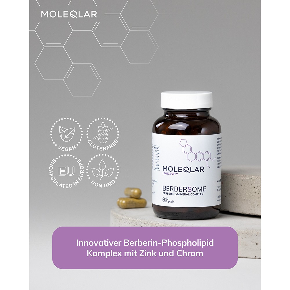 Berbersome ist ein hochkarätiger Molekül-Komplex aus Berberin-Phospholipid und einem Mineral-Komplex. Hochreines Berberin ist hierbei von einer speziellen Phospholipidschicht umgeben, die die Bioverfügbarkeit des Moleküls unvergleichbar steigert.