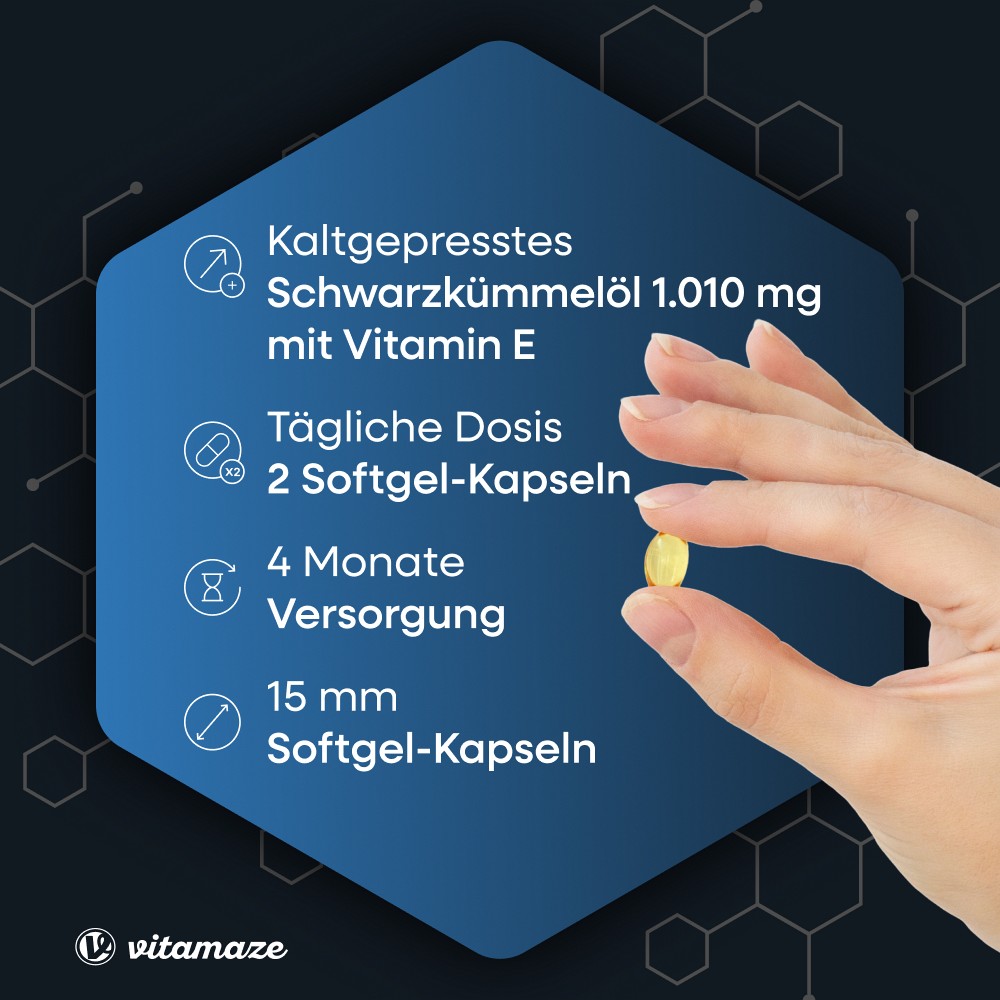 - Kombination aus 1010 mg Schwarzkümmelöl + 10 mg α-TE Vitamin E (pro Tagesdosis)