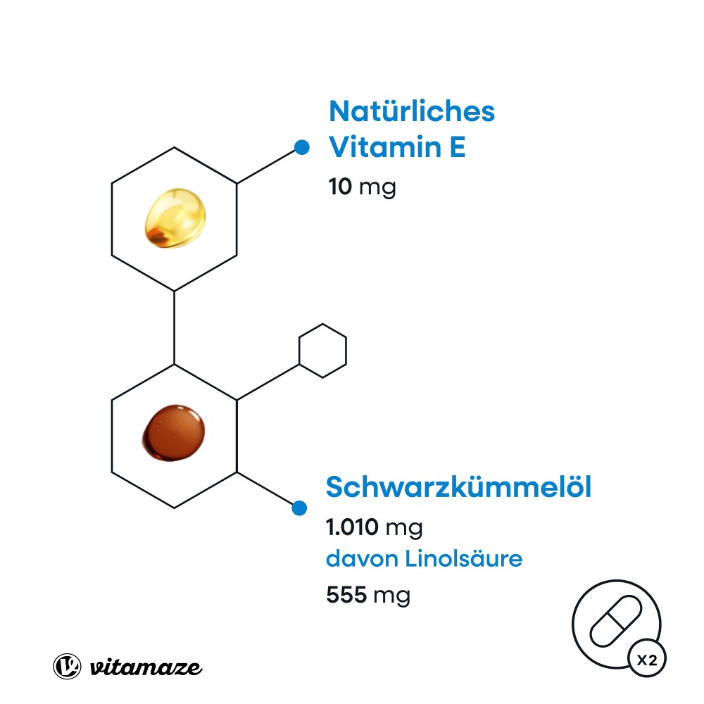Hochwertige Kombination aus kaltgepresstem ägyptischem Nigella sativa Öl (Schwarzkümmelöl) und natürlichem Vitamin E, das zum Schutz der Zellen vor oxidativem Stress beiträgt.Jede vegane Kapsel enthält 1010 mg Schwarzkümmelöl pro Tagesdosis, davon 555 mg Linolsäure – mit einem besonders hohen Anteil von 55 %. In bewährter Vitamaze-Qualität.