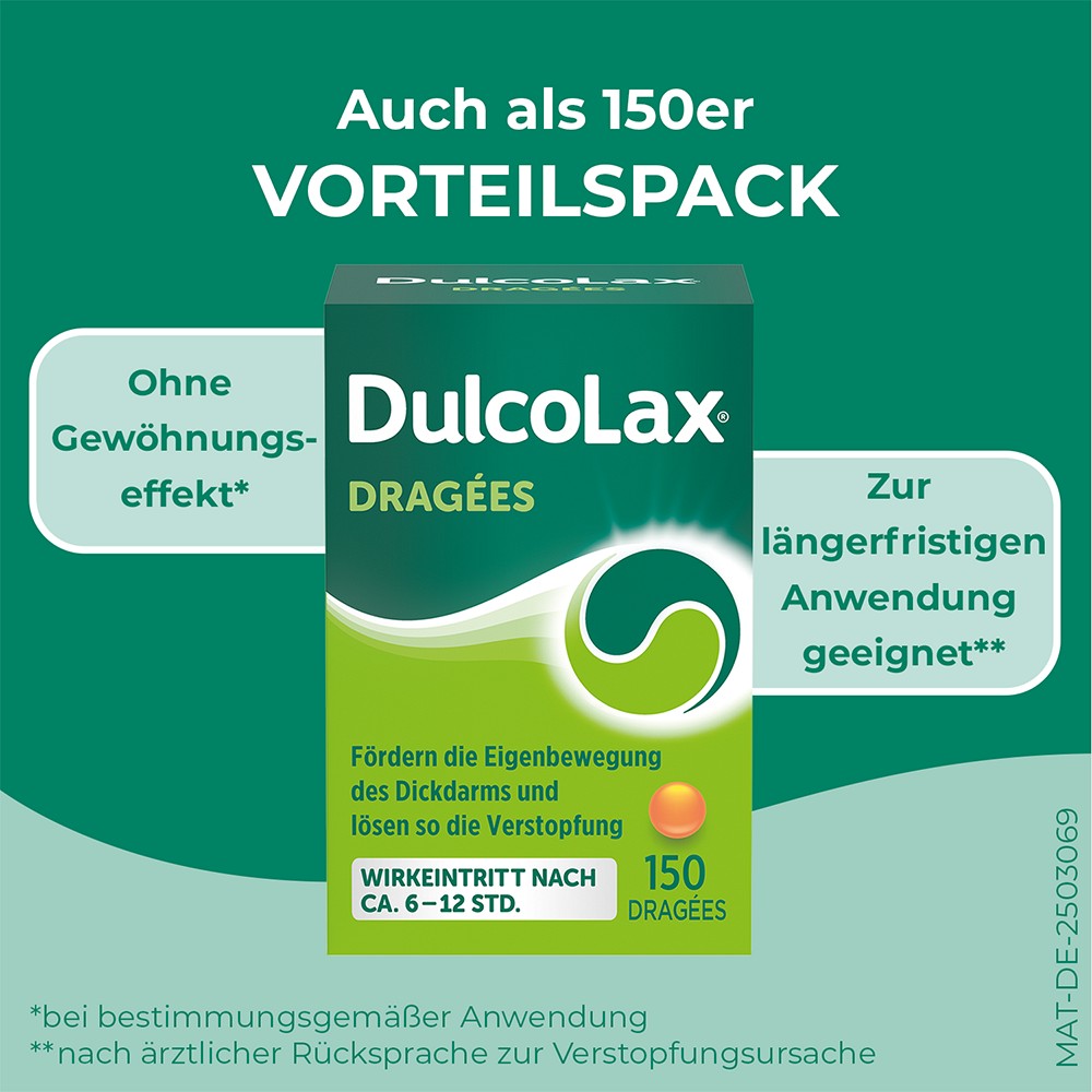 Völlegefühl, Bauchschmerzen und ausbleibender Stuhlgang – was tun, wenn eine Verstopfung das Wohlbefinden belastet? Dulcolax Dragées befreien planbar von Verstopfung, sie sind gut verträglich und einfach in der Handhabung.Dank der Spezial-Umhüllung der Dulcolax Dragées wird der Wirkstoff Bisacodyl genau dort freigesetzt, wo er gebraucht wird – im Dickdarm, hier aktiviert er die natürliche Eigenbewegung des Darms und löst so die Verstopfung.