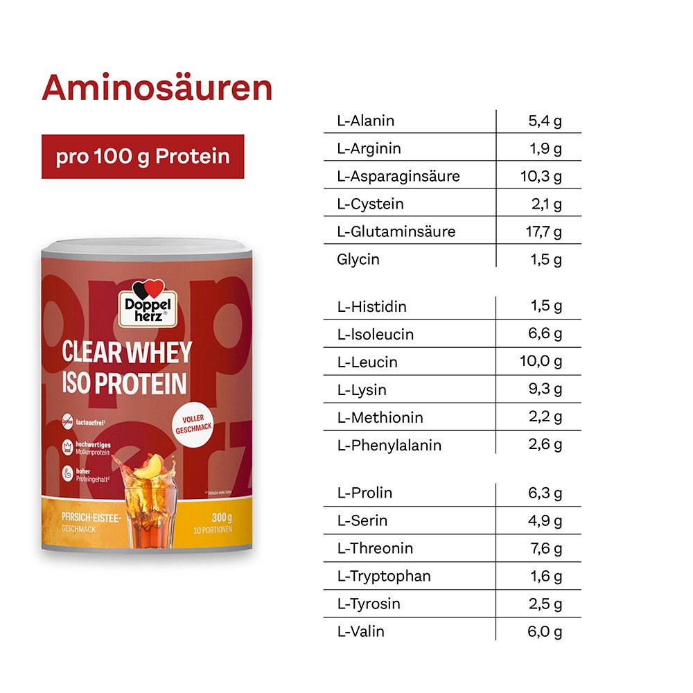 Doppelherz CLEAR WHEY ISO PROTEIN kombiniert hochwertige Proteinqualität mit sommerlich-leichtem Geschmack – für alle, die auf eine klare, fruchtige Alternative zum klassischen cremigen Proteinshake setzen. Die Sorte Pfirsich-Eistee überzeugt durch ihre Konsistenz, sehr gute Löslichkeit und angenehme Frische – ideal nach dem Sport, an warmen Tagen oder als Teil einer eiweißbewussten Ernährung.