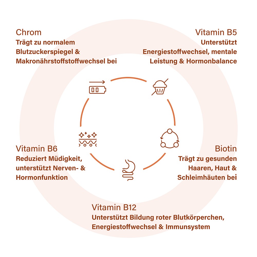 Die Kombination aus Inulin, Chrom und aktiven B-Vitaminen trägt zur Unterstützung eines normalen Blutzuckerspiegels, des Makronährstoffstoffwechsels und des Energiestoffwechsels bei.