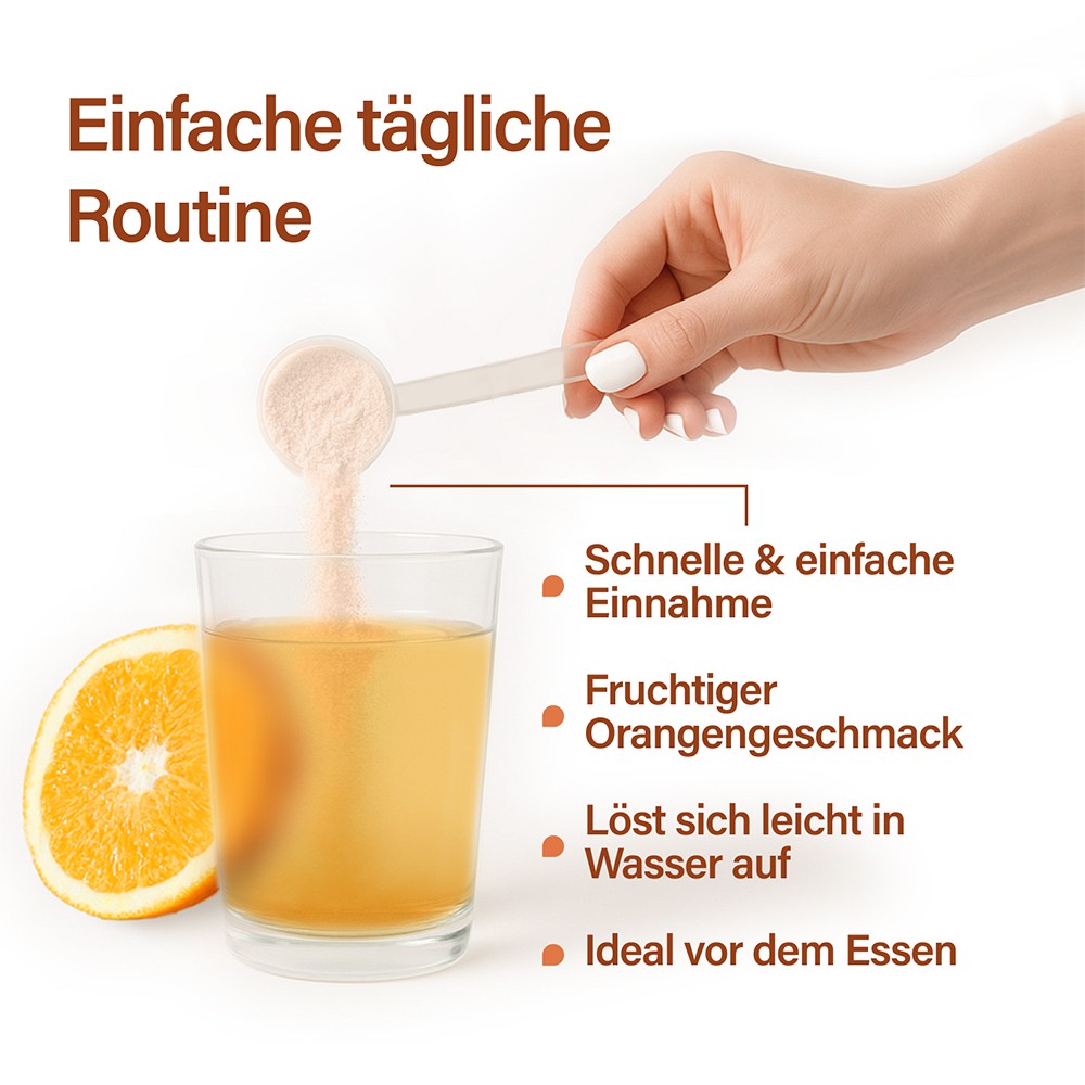 Das Pulver hat einen angenehm fruchtigen Geschmack nach Orange und lässt sich leicht in Wasser auflösen.
