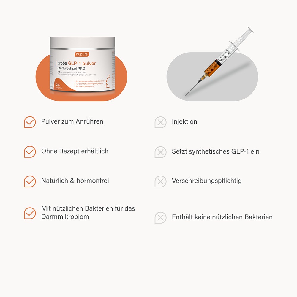 Proba GLP-1 Stoffwechsel PRO Pulver steigert auf natürliche Weise den GLP-1-Spiegel und senkt Ghrelin – das Hungerhormon – für ein schnelleres und länger anhaltendes Sättigungsgefühl.