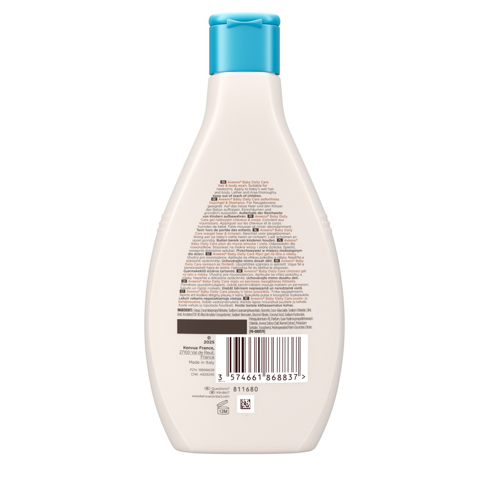 Aveeno baby daily care seifenfreies Duschgel & Shampoo mit natürlichem Haferexktrakt nährt, beruhigt & schützt empfindliche Babyhaut ab Tag 1. Es reinigt sanft, schützt von Kopf bis Fuß und ist für Neugeborene und Kindern mit normaler bis trockener, empfindlicher Haut geeignet.