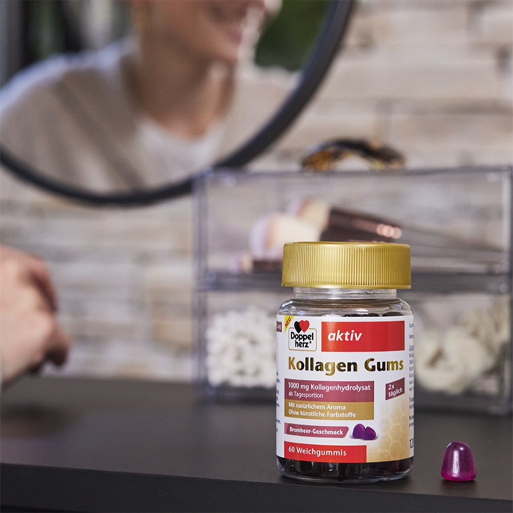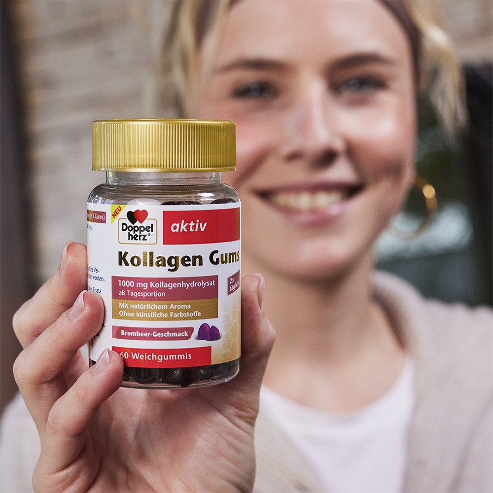 Die Doppelherz Kollagen Gums enthalten pro Tagesportion (2 Gums) 1000 mg Kollagenhydrolysat – ganz ohne künstliche Farbstoffe und mit natürlichem Aroma. Die Gums bieten eine einfache Möglichkeit, Kollagen in den Alltag und in die tägliche Routine zu integrieren. Kollagen ist das am häufigsten vorkommende Protein im menschlichen Körper und befindet sich vor allem in der Haut, im Knochen, Knorpel und Bindegewebe.