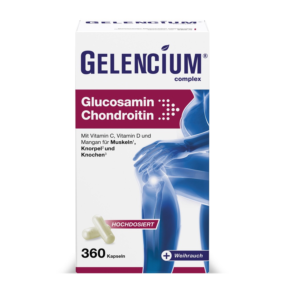 GELENCIUM Glucosamin Chondroitin ist ein modernes, hochdosiertes Komplexpräparat der führenden Arthrose-Apothekenmarke GELENCIUM. Dieses kombiniert erstmalig die essenziellen Gelenkbausteine Glucosamin und Chondroitin mit Weihrauch und ausgewählten Mikronährstoffen für die Gelenkgesundheit. Im Wettbewerbsvergleich herausragend ist die einzigartig hohe Tagesdosis von 2.325 mg Glucosaminsulfat + Chondroitinsulfat.