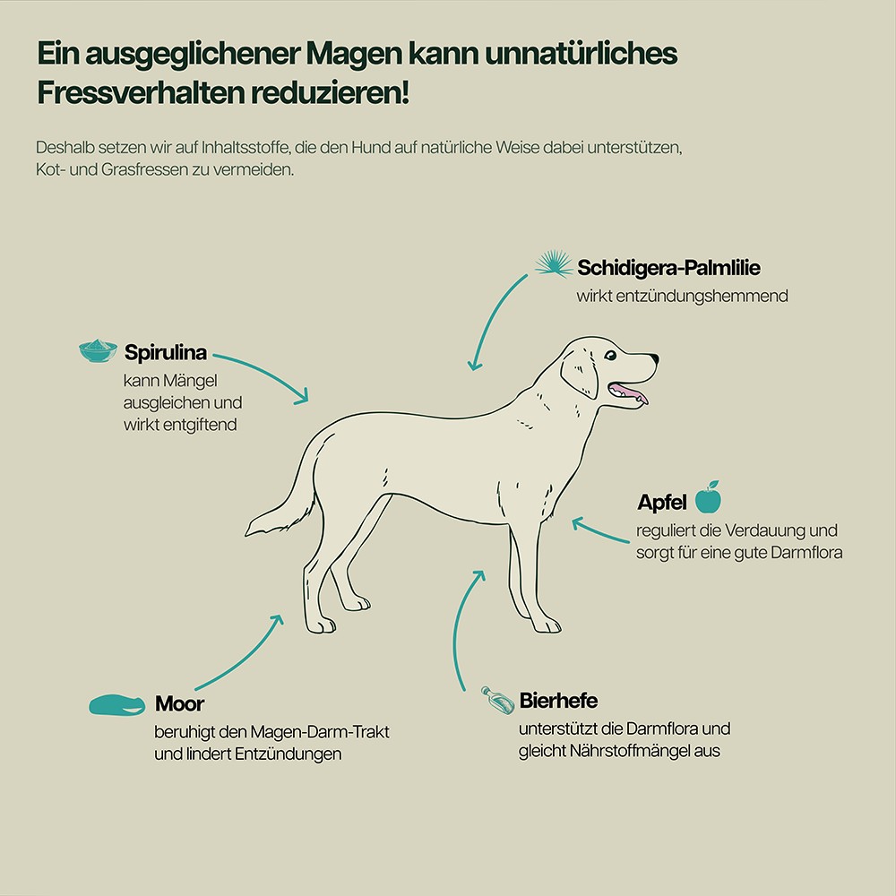 Fördere die Darmgesundheit deines Hundes auf natürliche Weise! Unsere funktionalen Hundesnacks sind reich an Ballaststoffen, unterstützen eine gesunde Verdauung und können dazu beitragen, das Fressen von Gras, Kot und Erde zu regulieren. Gesunde Ernährung – glücklicher Hund!
