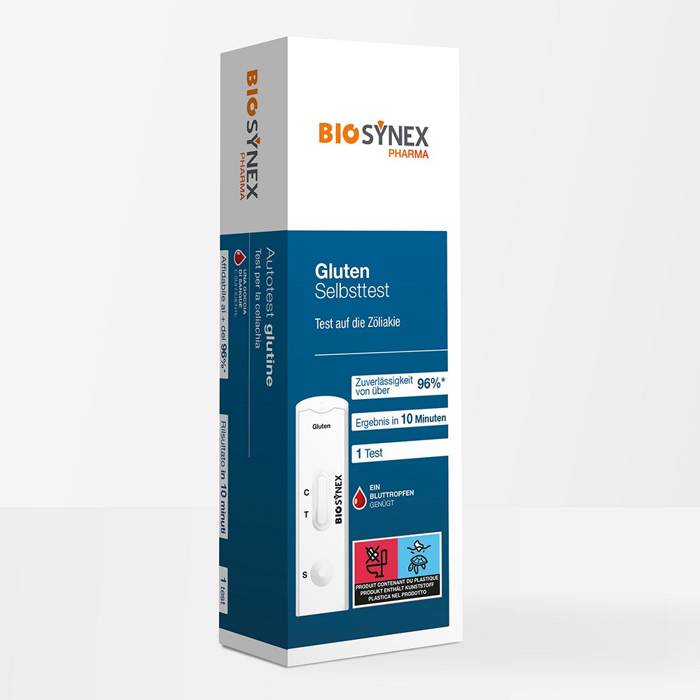 Der BIOSYNEX Gluten-Selbsttest ist ein immunchromatographischer In-vitro-Test zum qualitativen Nachweis von IgG-Antikörpern gegen deamidierte Gliadinpeptide (DGP) im kapillaren Vollblut. Diese Antikörper können im Rahmen einer Zöliakie auftreten.Der Test dient der diagnostischen Orientierung bei Verdacht auf Zöliakie und liefert innerhalb von ca. 10 Minuten ein visuell ablesbares Ergebnis. Die Testgenauigkeit wurde in einer Studie mit einer Übereinstimmung von 96,7 % ermittelt. Die Anwendung ist bei Erwachsenen sowie bei Kindern ab 2 Jahren möglich. Bei Kindern muss die Testdurchführung durch einen Erwachsenen erfolgen bzw. unter dessen Aufsicht stattfinden.