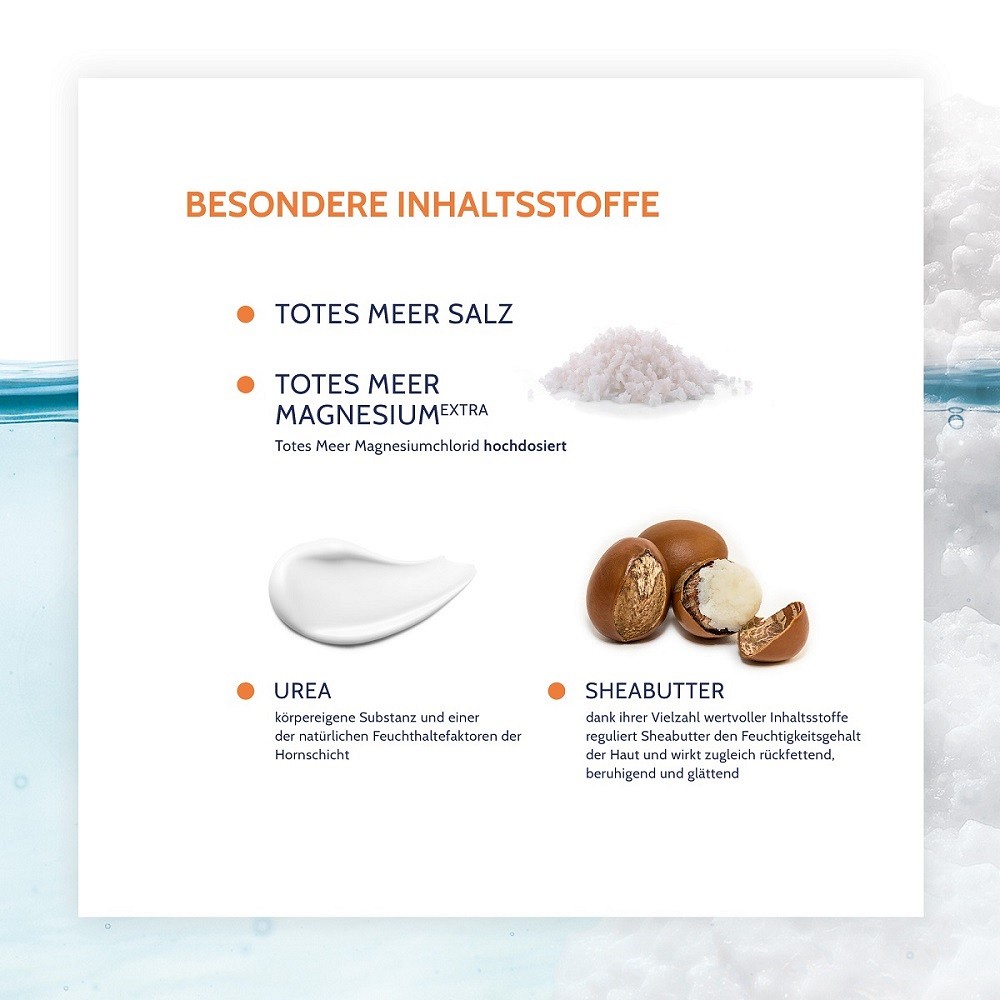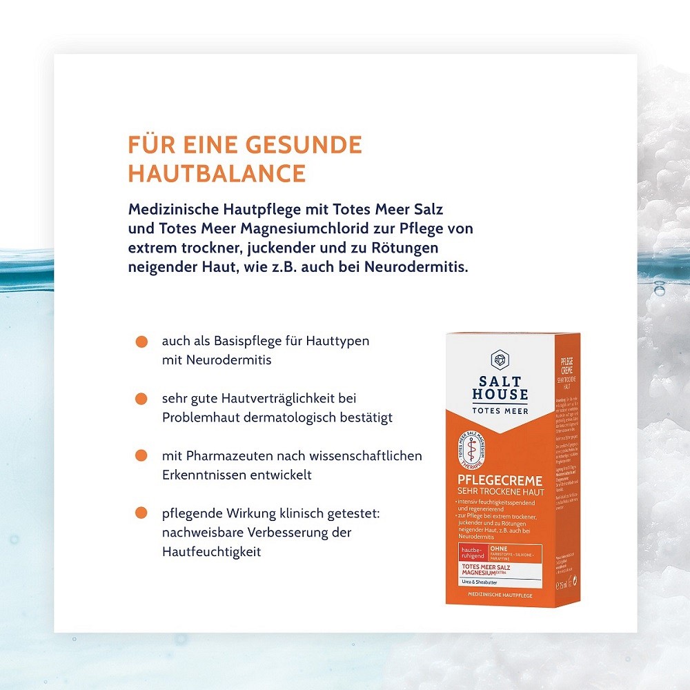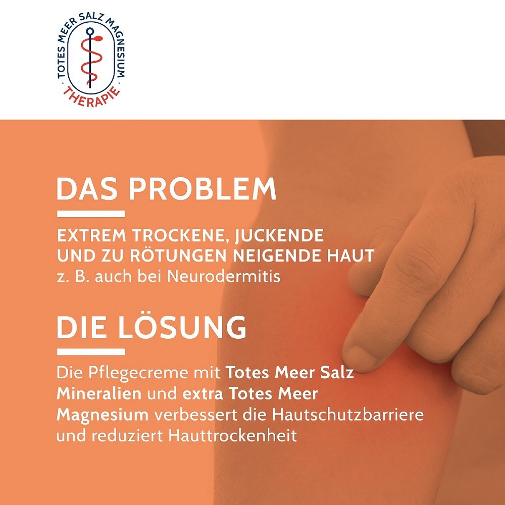 Die medizinische Pflegecreme sehr trockene Haut wurde speziell zur beruhigenden Pflege extrem trockener, juckender und zu Rötungen neigender Haut entwickelt – wie z.B. auch bei Neurodermitis. Die reichhaltige, intensiv feuchtigkeitsspendende Formel kombiniert wertvolle Totes Meer Mineralien und extra Magnesiumchlorid aus dem Toten Meer mit Urea und Sheabutter. Sie verleiht der Haut spürbare Geschmeidigkeit und Entspannung, verbessert nachweislich den Feuchtigkeitsgehalt und schützt vor übermäßigem Feuchtigkeitsverlust. Gleichzeitig unterstützt sie die natürliche Hautschutzbarriere und hilft, Hautirritationen vorzubeugen.