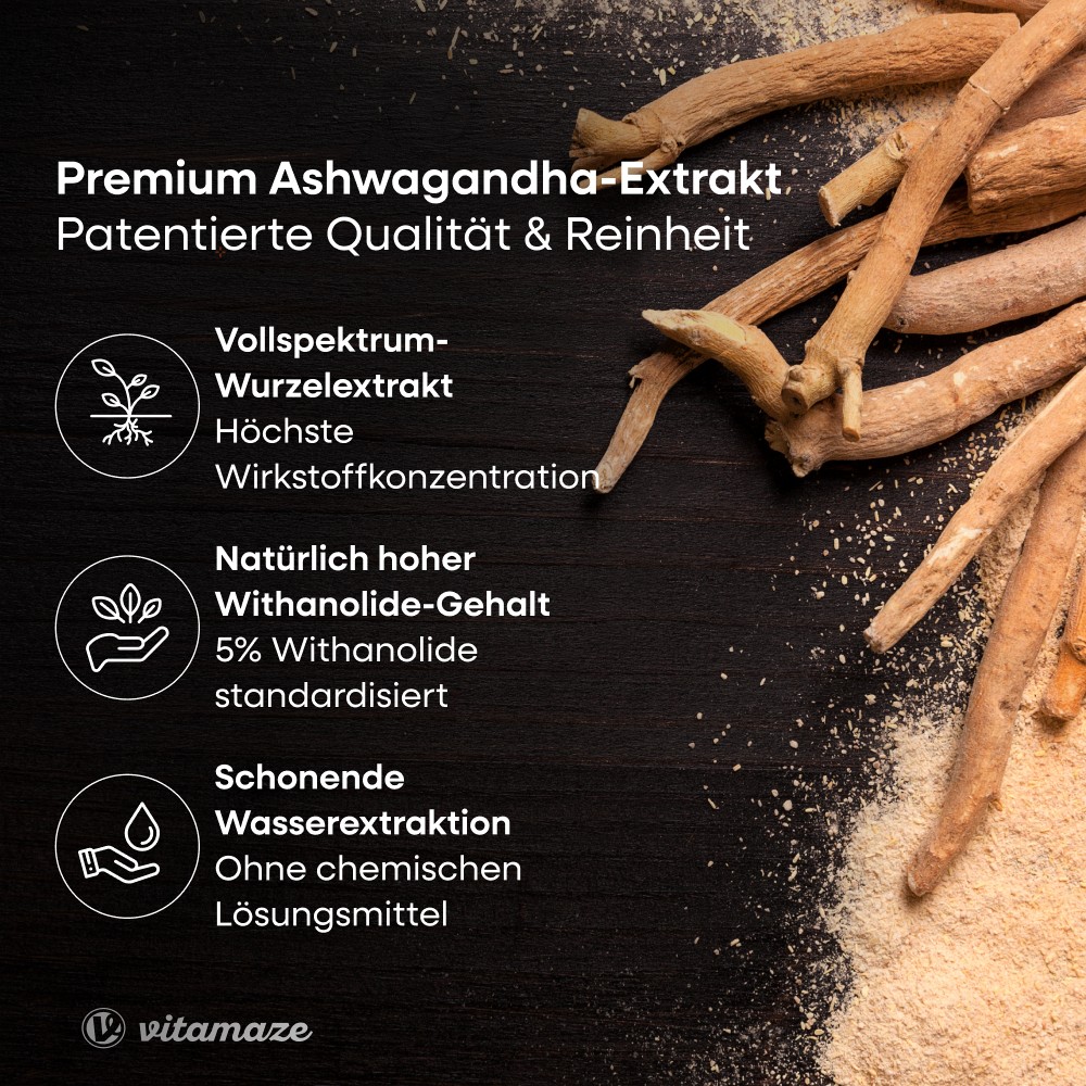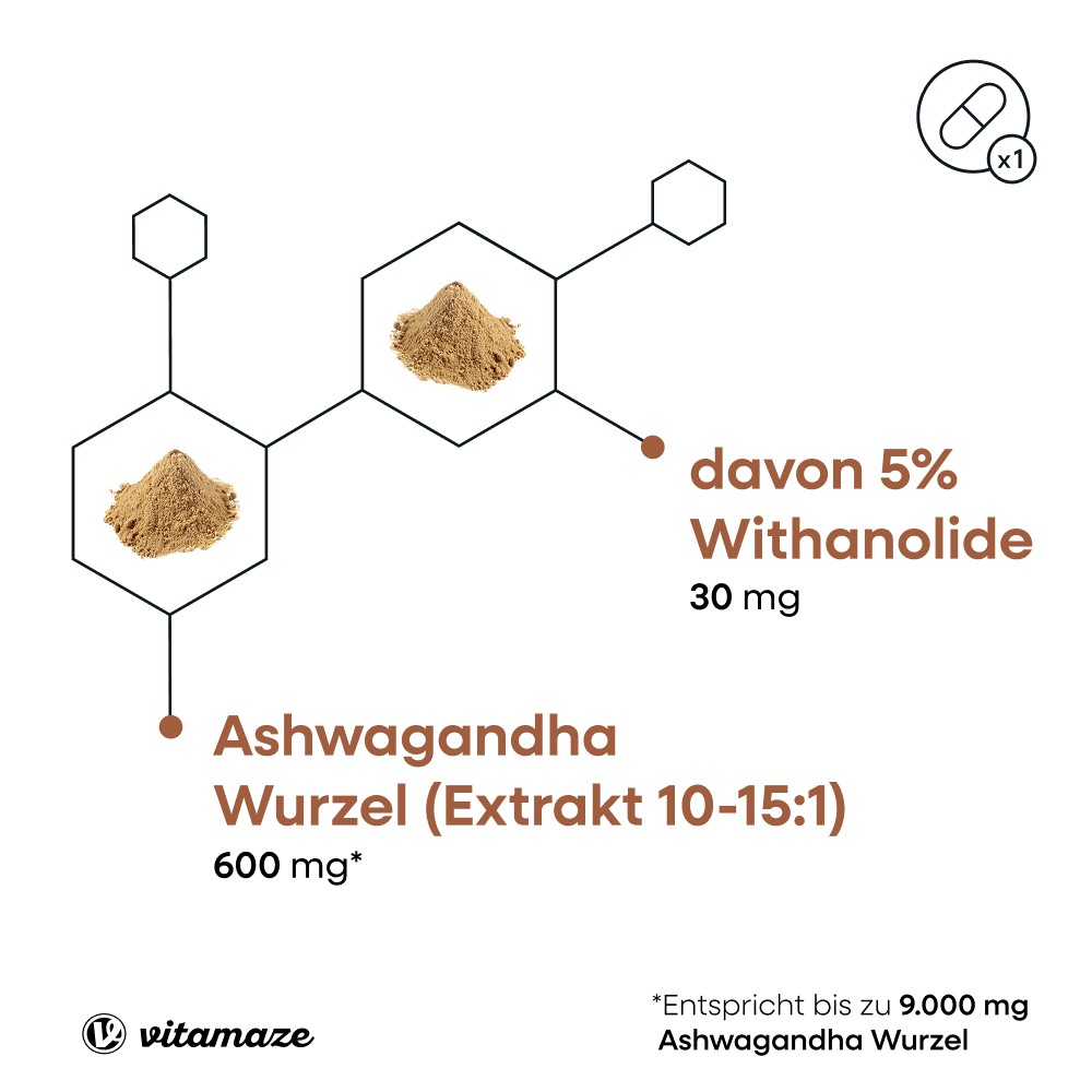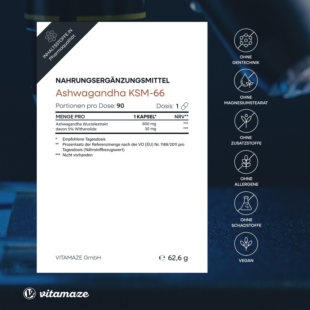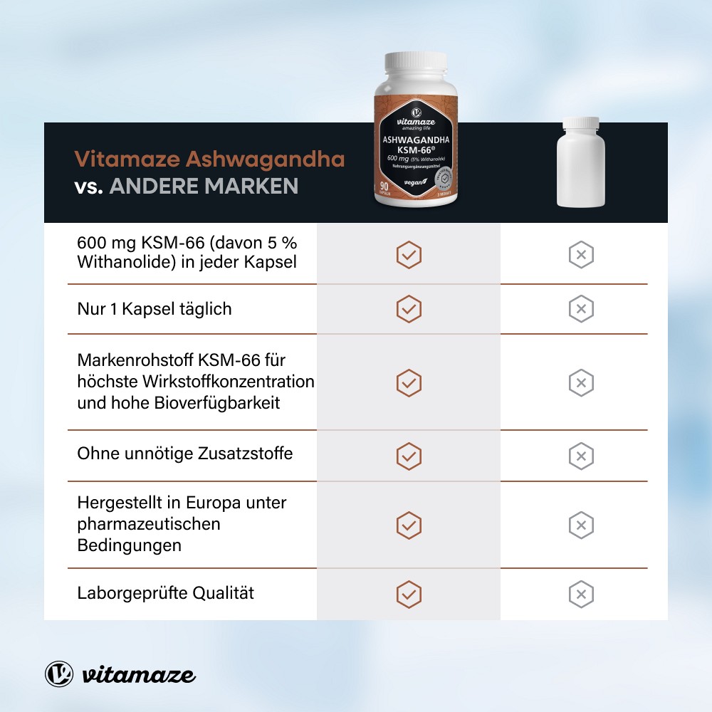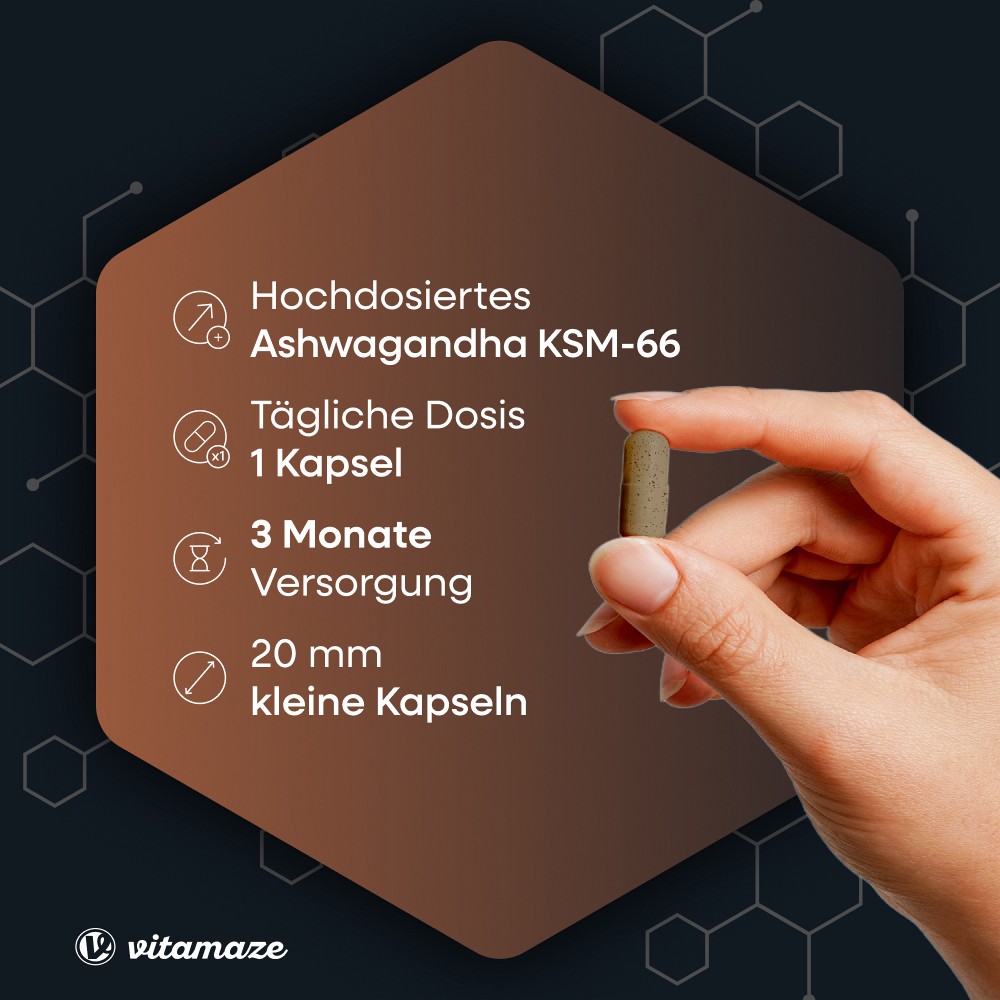 Ashwagandha, auch bekannt als Indischer Ginseng oder Schlafbeere, ist eine Pflanze, die ihre Wurzeln tief in der Geschichte der indischen Ernährungskunde hat. Diese robuste Pflanze, wissenschaftlich als Withania somnifera bezeichnet, ist in den trockenen Regionen Indiens und Nordafrikas beheimatet und für ihre Anpassungsfähigkeit an harsche Umweltbedingungen bekannt.Vitamaze Ashwagandha KSM-66 enthält 600 mg des Wurzelpulvers pro Kapsel, einschließlich 5% Withanolide, die aus der Wurzel der Pflanze extrahiert werden. In den Wurzeln von Ashwagandha finden sich Withanolide, sekundäre Pflanzenstoffe, die für ihre schützenden Eigenschaften bekannt sind.