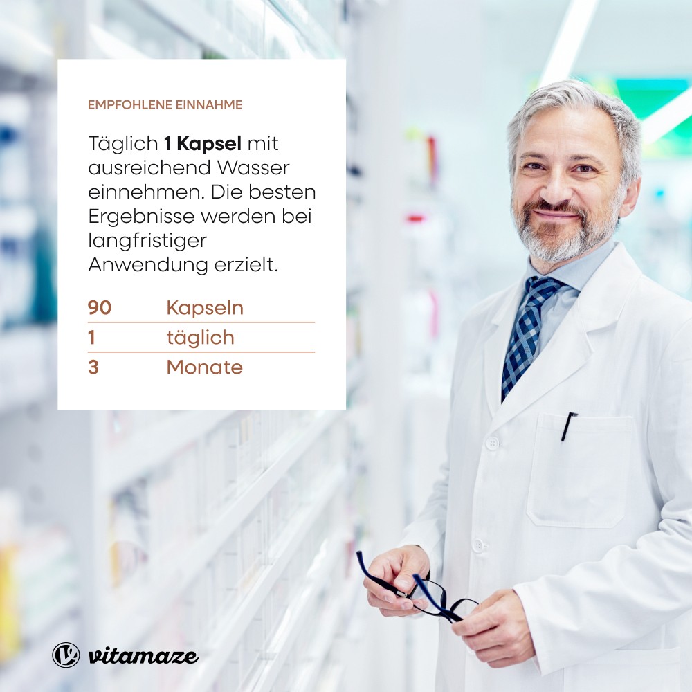Produziert unter strengen Qualitätskontrollen, sind die Kapseln frei von unnötigen Zusatzstoffen, Nanopartikeln und Allergenen. Jede Packung enthält 90 Kapseln, die für eine Dauerversorgung von drei Monaten ausgelegt sind.