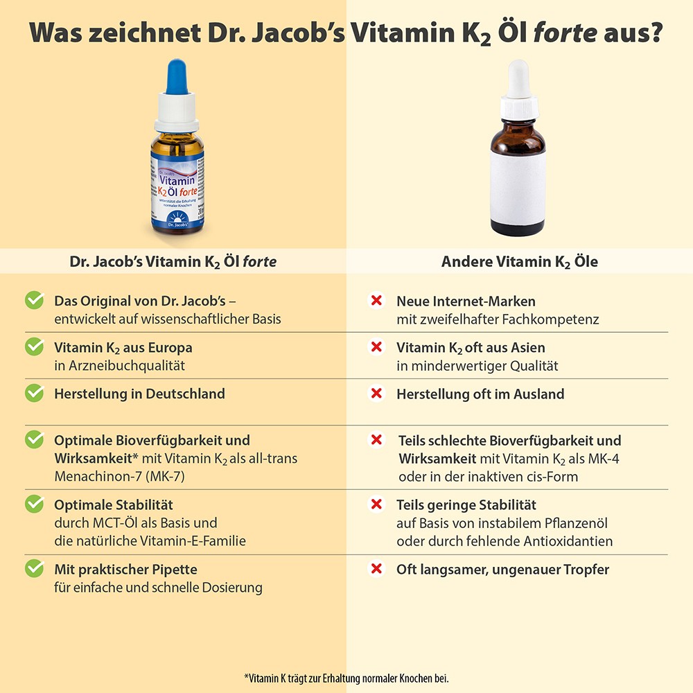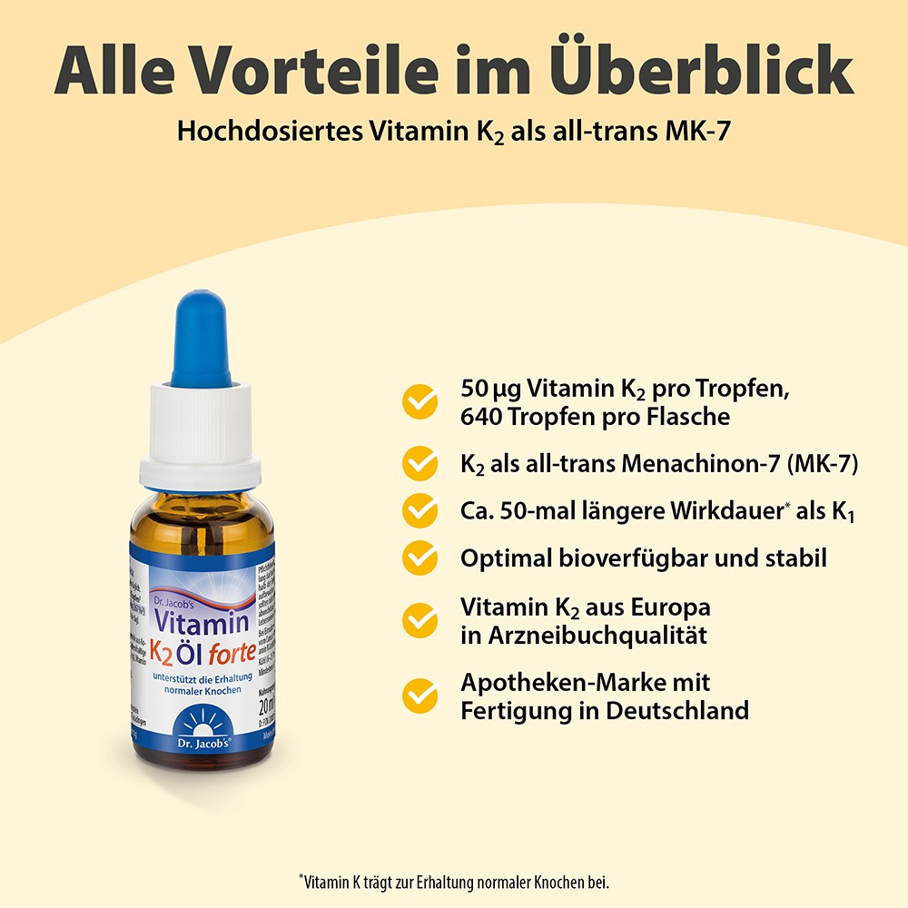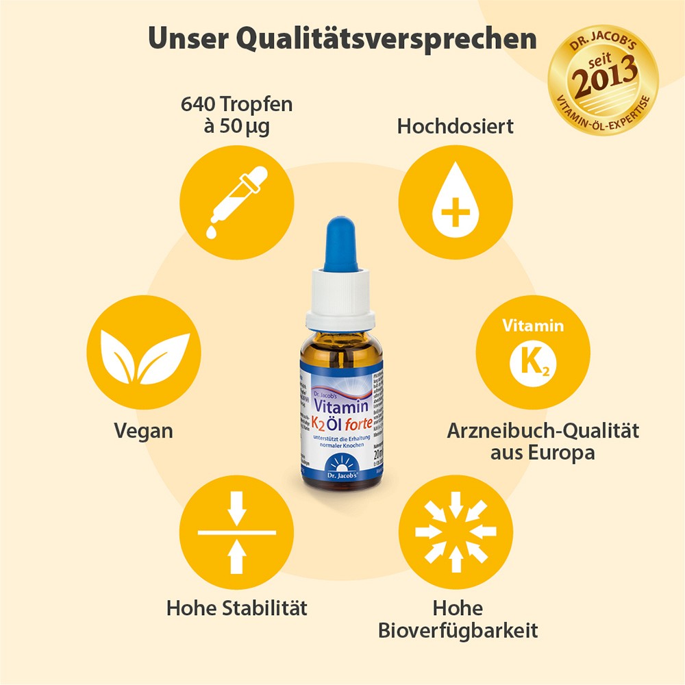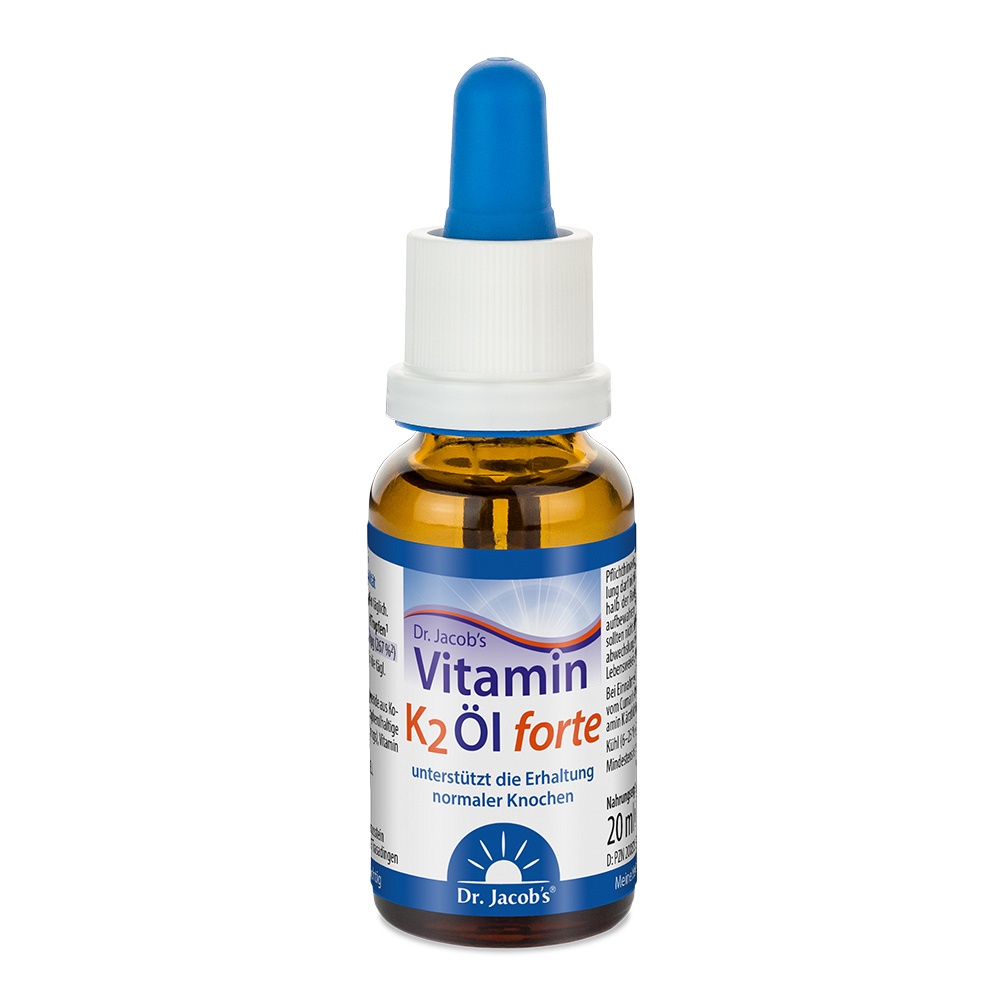 Dr. Jacob’s Vitamin-Öle sind leicht dosierbar, ideal bei Schluckbeschwerden und dank 640 Tropfen pro Flasche besonders ergiebig. Ein Tropfen Dr. Jacob’s Vitamin K2 Öl forte enthält 50 μg Vitamin K2 (all-trans MK-7).