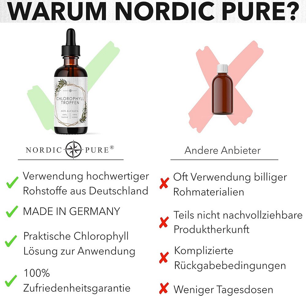 Mit den Nordic Pure Chlorophyll-Tropfen wählst Du ein Nahrungsergänzungsmittel, das nach höchsten Standards in Deutschland hergestellt und abgefüllt wird. Jede Charge wird streng geprüft, sodass Du Dich jederzeit auf gleichbleibende Qualität verlassen kannst.