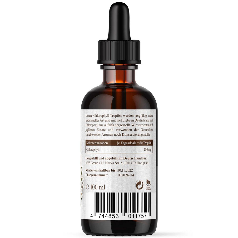 In der lichtgeschützten Braunglasflasche bleiben die Inhaltsstoffe zuverlässig bewahrt, und dank der präzisen Pipette gelingt die Dosierung von 200 mg Chlorophyll pro Tagesportion ganz einfach.