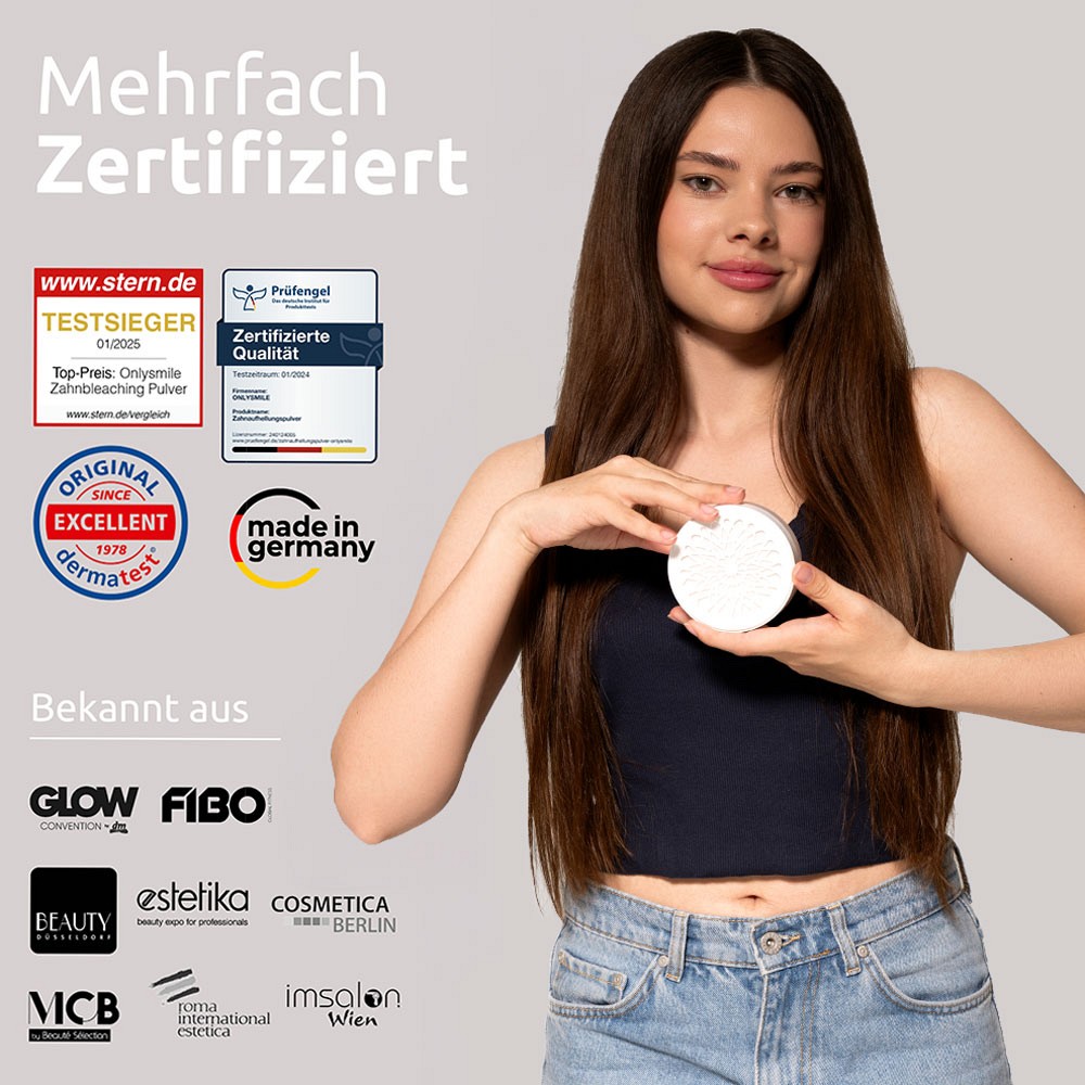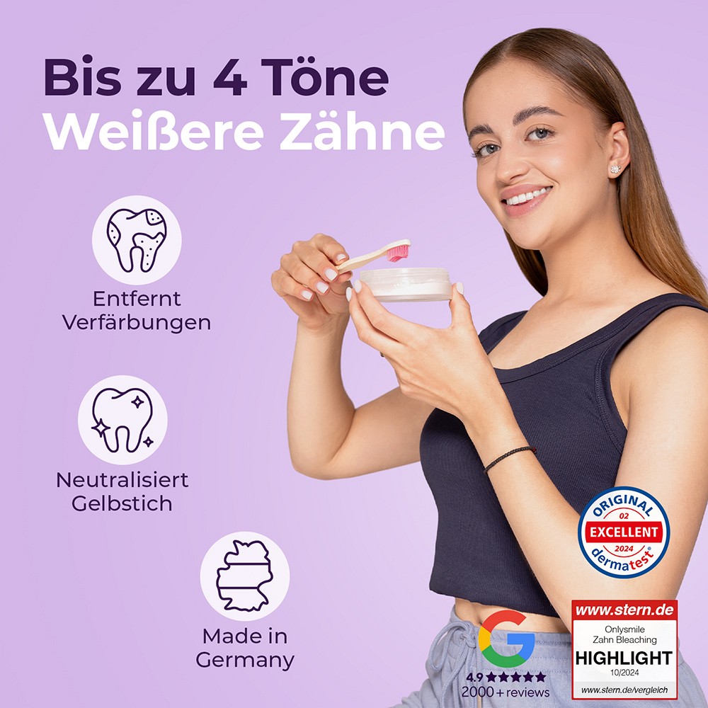 Das OnlySmile Zahnaufhellungspulver bietet eine effektive und zugleich schonende Möglichkeit, Zahnverfärbungen sichtbar zu reduzieren und das natürliche Zahnweiß zu unterstützen. Entwickelt für die tägliche Anwendung, eignet sich das Pulver ideal zur Vorbereitung auf eine professionelle Zahnaufhellung sowie als Nachbehandlung zur langfristigen Erhaltung bereits erzielter Ergebnisse.Die innovative Anti-Flecken-Formel „Anti-Stain Formula“ kombiniert Reinigungskraft mit einem angenehmen Wassermelonen-Geschmack und sorgt für ein frisches Mundgefühl. Gleichzeitig werden Zahnbelag, Bakterien und hartnäckige Verfärbungen – etwa durch Tee, Kaffee, Rotwein oder Nikotin – zuverlässig entfernt.