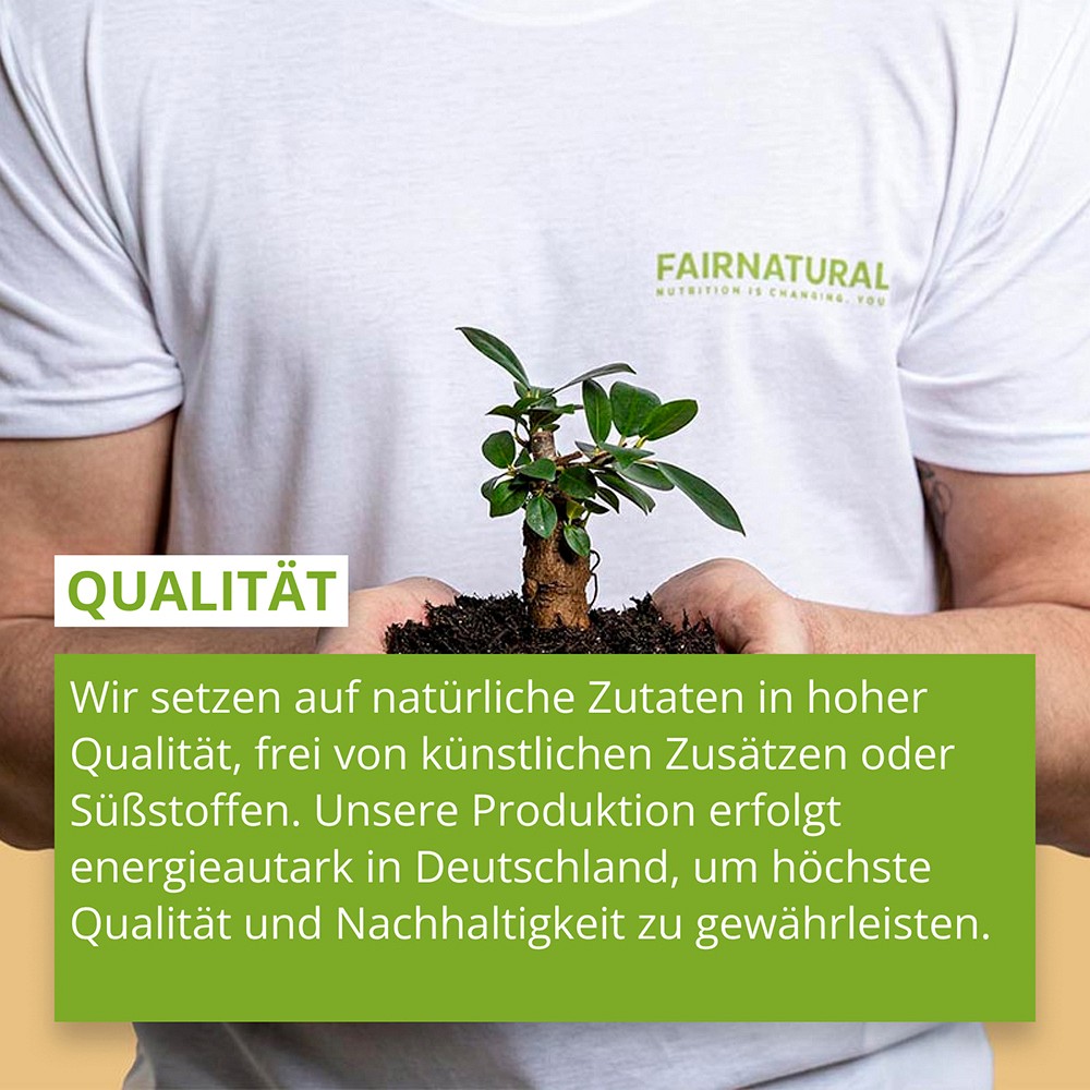 Wir bei FAIRNATURAL haben eine Mission: Dir die pure Kraft der Natur zu bieten, ohne Kompromisse. Mit 100 % natürlichen, nachhaltigen Produkten, die frei von Gentechnik, künstlichen Aromen und Konservierungsstoffen sind. Dabei verzichten wir ganz bewusst auf unnötige Chemie, schädliche Süßstoffe und umweltfeindliche Verpackungen.Unsere Herstellung erfolgt nach höchsten Standards – HACCP & FSSC 22000 – damit du immer das Beste bekommst. Alles wird bei Heidelberg in Deutschland produziert, regional und mit Liebe zum Detail. Deine bewusste Wahl unterstützt nicht nur deine Gesundheit, sondern auch unseren Planeten. Sei die Fairänderung, die die Welt braucht. Werde jetzt ein Teil unserer Familie – der FAIRNATURAL-FAMILIE.