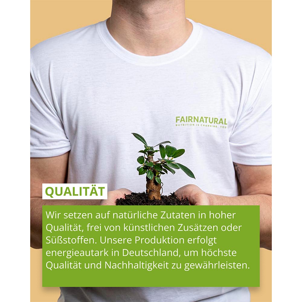 Wir bei FAIRNATURAL haben eine Mission: Dir die pure Kraft der Natur zu bieten, ohne Kompromisse. Mit 100 % natürlichen, nachhaltigen Produkten, die frei von Gentechnik, künstlichen Aromen und Konservierungsstoffen sind. Dabei verzichten wir ganz bewusst auf unnötige Chemie, schädliche Süßstoffe und umweltfeindliche Verpackungen.Unsere Herstellung erfolgt nach höchsten Standards – HACCP & FSSC 22000 – damit du immer das Beste bekommst. Alles wird bei Heidelberg in Deutschland produziert, regional und mit Liebe zum Detail. Deine bewusste Wahl unterstützt nicht nur deine Gesundheit, sondern auch unseren Planeten. Sei die Fairänderung, die die Welt braucht.