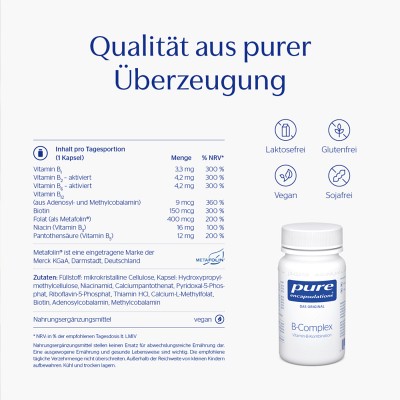 Wenn die Herausforderungen des Alltags immer mehr werden, brauchst du eine leistungsbereite Psyche. B-Vitamine wie B6 und B12 sind dabei deine idealen Partner für gesunden Nerven. Pure Encapsulations® bietet B-Complex mit allen acht B-Vitaminen in idealer Dosierung und geprüfter Qualität für eine langfristige Anwendung.Gesundheitlicher Nutzen der Inhaltsstoffe