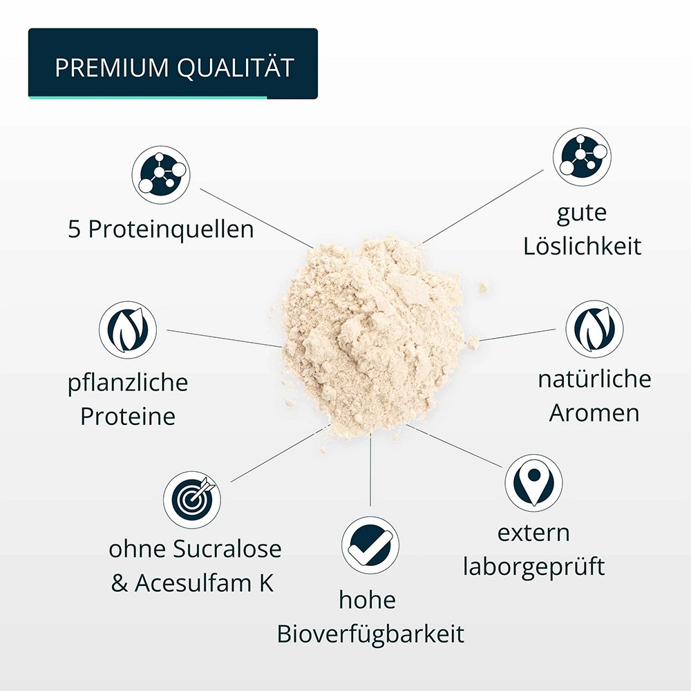 Mit einem Mix aus 4 ("Vegan") bzw. 5 ("Allesesser") hochwertigen Proteinquellen hast du deinen neuen Shake gefunden. Transparenz und Qualität haben bei uns oberste Priorität, daher wird der Shake in Deutschland unter höchsten Qualitätsstandards hergestellt (primäre Zutat aus der EU).