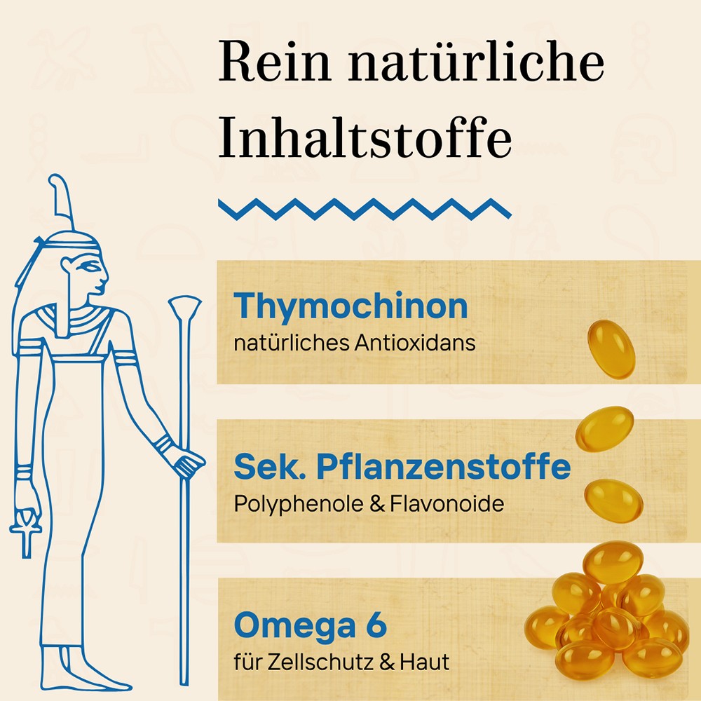 Das Schwarzkümmelöl in den Kapseln stammt aus kontrolliert biologischem Anbau in den fruchtbaren Oasen Ägyptens. Schwarzkümmel wird seit über 3000 Jahren in der altägyptischen Tradition geschätzt – schon in den Gräbern der Pharaonen fanden sich Schwarzkümmel-Samen. Das sonnenreiche Wüstenklima entlang des Nils lässt besonders ölreiche und aromatische Samen gedeihen – die perfekte Grundlage für ein außergewöhnliches hochwertiges Schwarzkümmel-Öl in Kapselform.