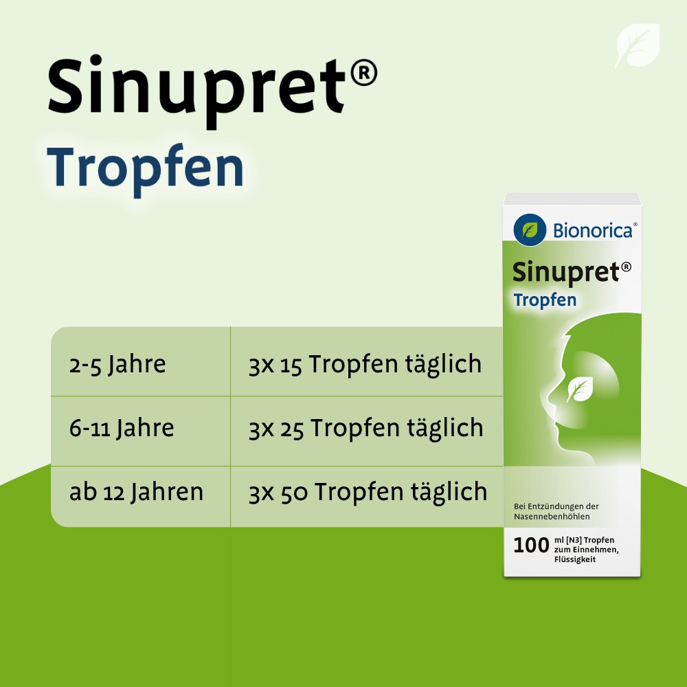 Sinupret Tropfen werden 3-mal täglich (morgens mittags und abends) unverdünnt oder in etwas Wasser eingenommen. Bei Bedarf kann mit Flüssigkeit (kein Alkohol) vorzugsweise einem Glas Trinkwasser nachgespült werden.Sinupret Tropfen können zum Essen mit Getränken oder auch unabhängig von den Mahlzeiten eingenommen werden.