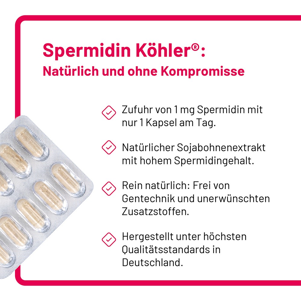 Spermidin Köhler® enthält einen Extrakt aus gentechnikfreien Sojabohnen europäischen Anbaus und ermöglicht eine ergänzende Versorgung mit Spermidin auf einfache und sichere Weise. Da Sojabohnenextrakt gegenüber anderen pflanzlichen Quellen einen relativ hohen natürlichen Anteil an Spermidin aufweist, wird dem Körper bereits durch 1 Kapsel Spermidin Köhler® 1 mg Spermidin zugeführt.