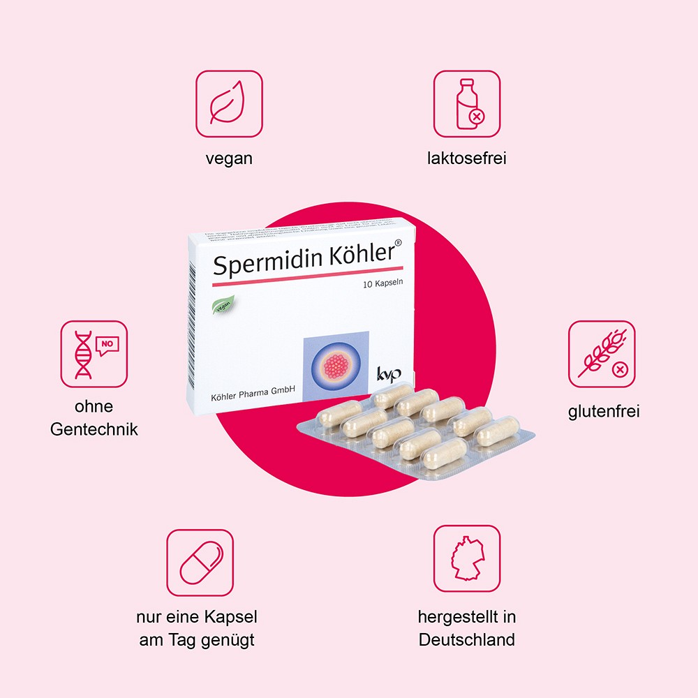 Spermidin Köhler® darf nicht von Kindern, Schwangeren und Stillenden eingenommen werden bzw. nur nach Rücksprache mit einem Arzt.Spermidin Köhler® ist glutenfrei, frei von Fruktose, Hefe, Laktose und Farbstoffen sowie laut Gesetz frei von Konservierungsstoffen sowie ohne Gentechnik. Spermidin Köhler® ist vegan.